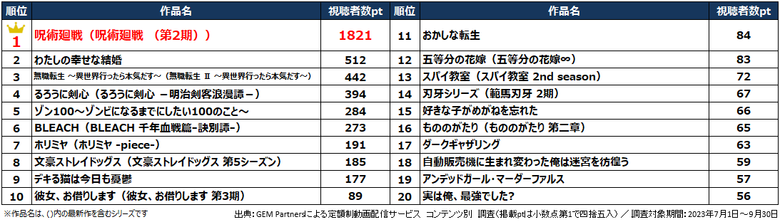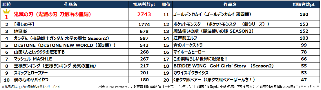 【集計方法】視聴したコンテンツについては自由回答方式で聴取。これをGEM Partners開発によるエンタメコンテンツ辞書を用いて名寄せ・集計を実施。コンテンツごとの視聴したシーズン数やエピソード数等は区別せず、一部でも観たと回答した人を視聴者としてカウント。また、劇場/テレビ版や海外/国内版も同一コンテンツとしてカウント(一部例外あり)。複数回観ても1カウントとしている。