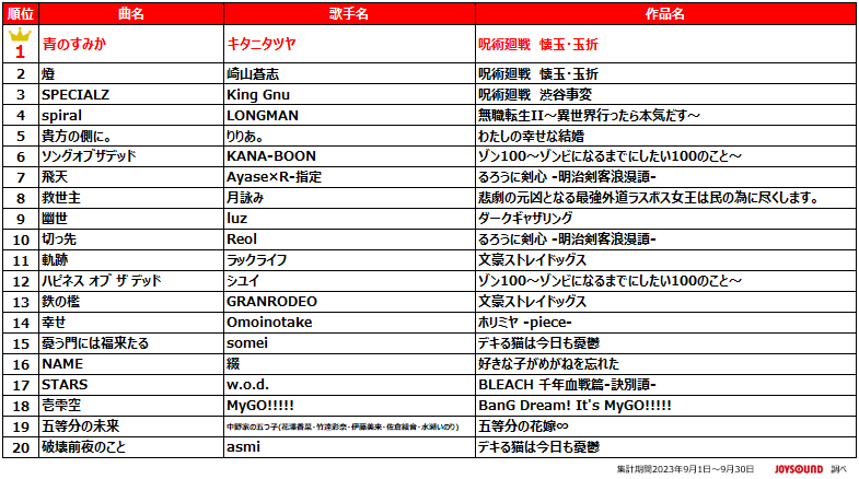 ▽2023年 夏アニメ主題歌ランキング:https://www.joysound.com/web/s/karaoke/contents/anime/ranking/2307