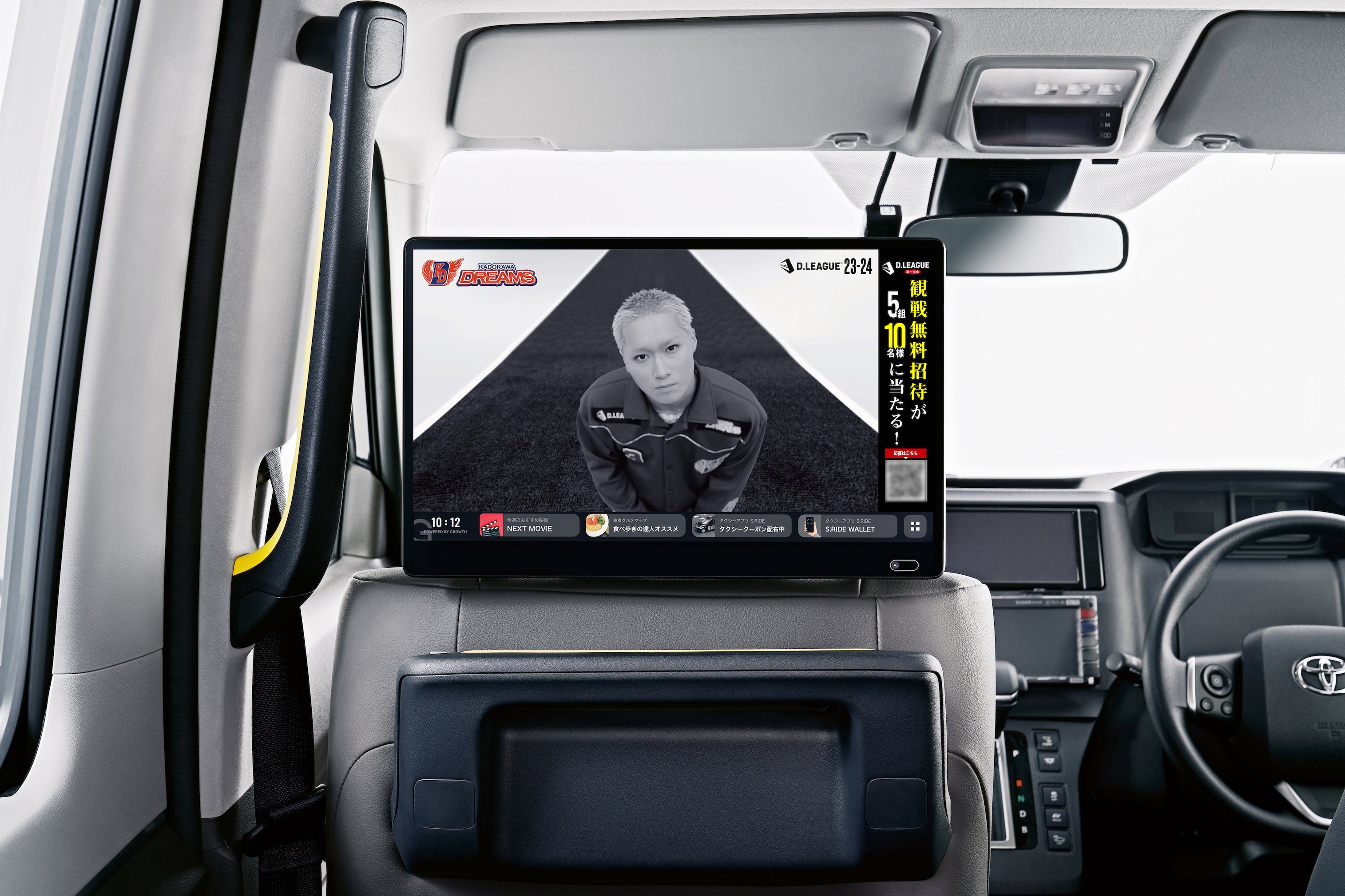 開幕に向けて都心100台限定でDAMを放映するジャック施策「D.LEAGUEカー」の走行が決定しました。13チームのDAMを放映するだけでなく、乗車いただいた方限定で、車内サイネージ『GROWTH』のサイドバナーのQRコードから抽選の応募ができ、ROUNDチケットが5組様10名にあたる限定応募抽選キャンペーンを同時開催します。そのほか、乗車直後の待機画面にて、Dリーグキービジュアルのフルバナーの掲載や、空車時は「車窓サイネージ『Canvas』 」でDリーグのクリエイティブを投影し開幕に向けて盛り上げてまいります。
