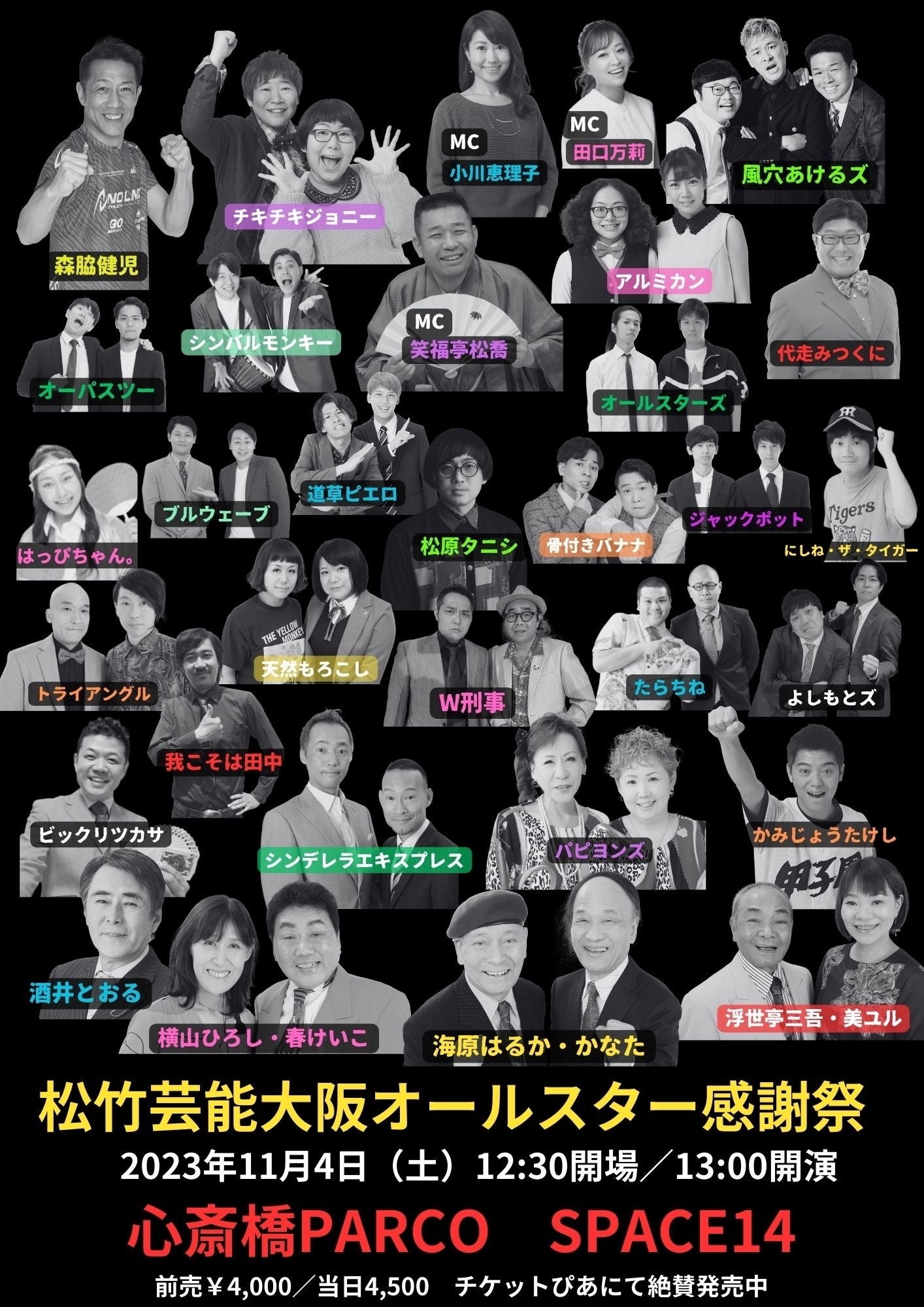 海原はるか・かなた、パピヨンズ、酒井とおる、森脇健児、シンデレラエキスプレス、代走みつくに、かみじょうたけし、チキチキジョニー、松原タニシ、アルミカン、風穴あけるズ、はっぴちゃん。などなどベテランから若手まで総勢30組が総出演するひと足早い年末大感謝ライブ!!一度でたっぷり松竹を堪能いただけます。是非お越しください。