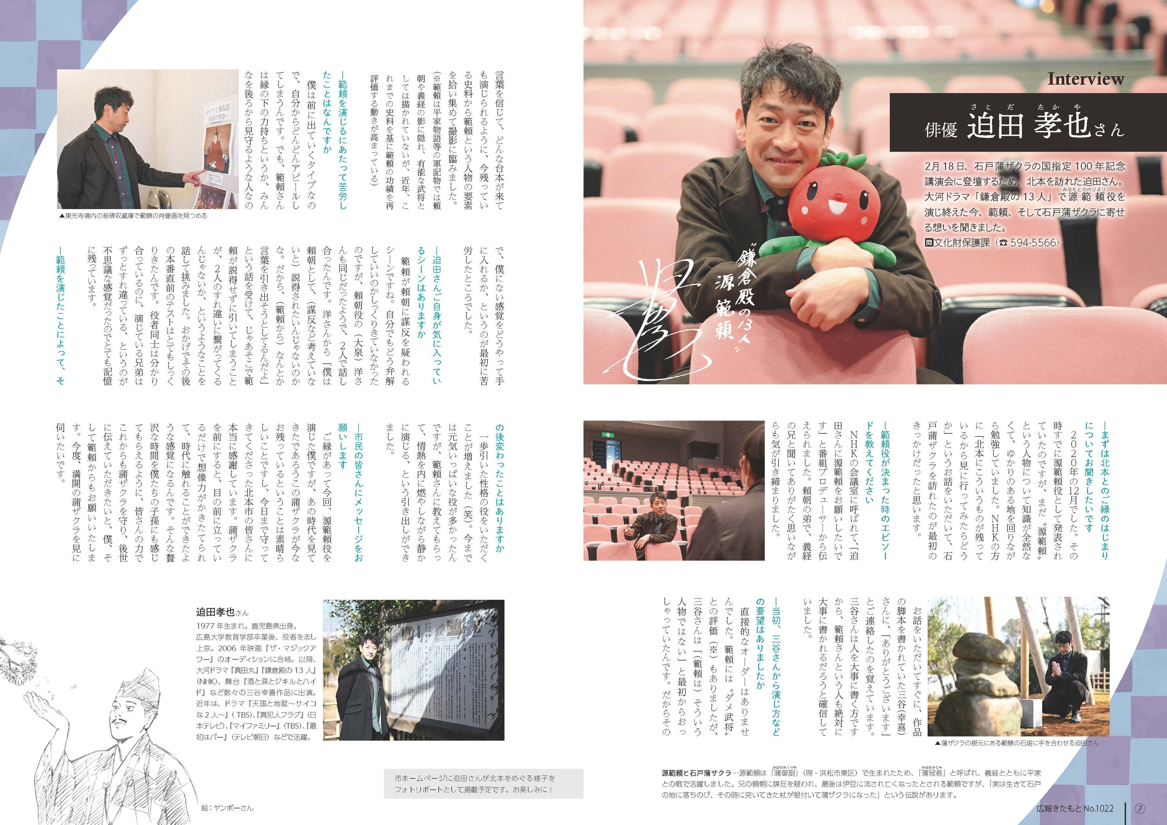迫田さんが演じた「源範頼」は、北本市にある国指定天然記念物「石戸蒲ザクラ」(樹齢800年)にまつわる伝説が残されています。これを記念し、今年の2月には迫田さんをお招きして蒲ザクラについてのトークショーを開催。大盛況を収めました。