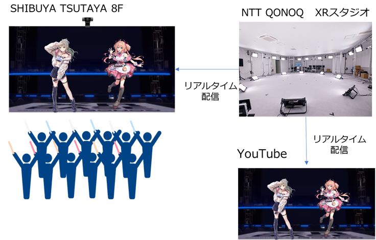 本システムは、XRスタジオのモーションキャプチャなど、演者のデータをリアルタイムにバーチャル空間上のキャラクターの動きとして生成し、XRによる音楽ライブや番組などを、リアル会場のスクリーンへの配信、VR配信、スマートフォンなどに向けたオンライン配信 など、リアルタイムに配信することが可能です。