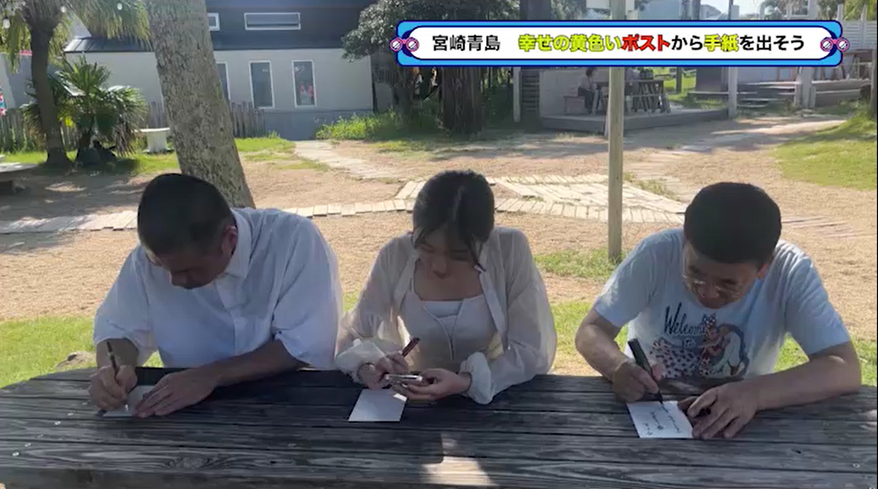 写真撮影の後は、3人が手紙を書いて「幸せの黄色いポスト」に投函することになりました。山名は相方の秋山に、あずはきよしに、そしてきよしは愛妻のヘレンに向けて、それぞれ筆をとります。