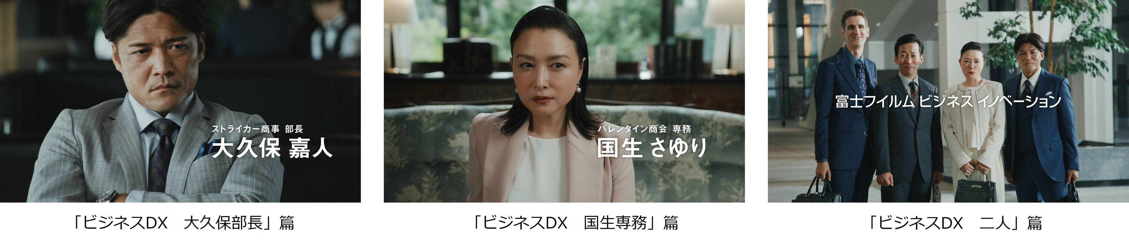TVCM「ビジネスDX」の第二弾となる新シリーズでは、「ビジネスDX 大久保部長」篇、「ビジネスDX 国生専務」篇、「ビジネスDX 二人」篇の3作品構成とし、最先端のITやAIを駆使したソリューション・サービスで企業のDX推進を支え、情報流通の促進や業務プロセスの効率化、意思決定の迅速化などを実現することを訴求。富士フイルムビジネスイノベーションが、お客様のビジネスの流れを変え、強化することを伝えます。