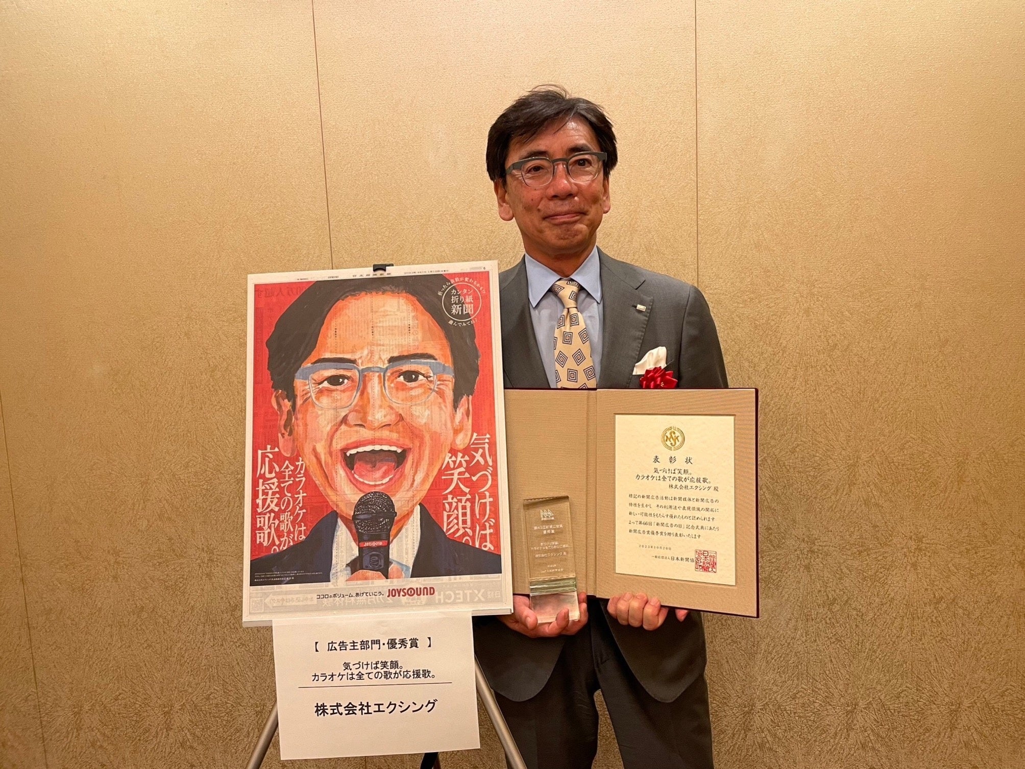 10月20日(金)に開催された第66 回「新聞広告の日」記念式典には、本広告においてマイクを握り、大きな口を開けて歌う男性のモデルをつとめた当社の代表取締役社長、水谷 靖本人が登壇し、表彰を受けました。