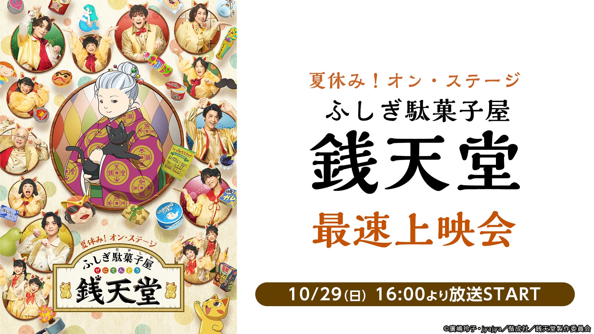 銭天堂の大人気エピソード「型ぬき人魚グミ」・「おもてナシ」・「ホーンテッドアイス」・「おっかさん仮面」のオムニバス形式でお送りする、歌とダンス満載の舞台。 夏休み!オン・ステージ「ふしぎ駄菓子屋 銭天堂」、開店でござんす。