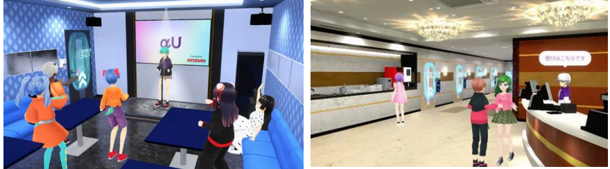 「αU metaverse」アプリから、どなたでも無料でご利用いただけます。渋谷センター街エリアの店舗入り口から「カラオケボックスαU」店内に入ると、リアルのカラオケボックスのような空間が現れます。受付では、カラオケルームの空き状況の確認や、大小さまざまなカラオケルームから自分の好きな部屋を選択できます。