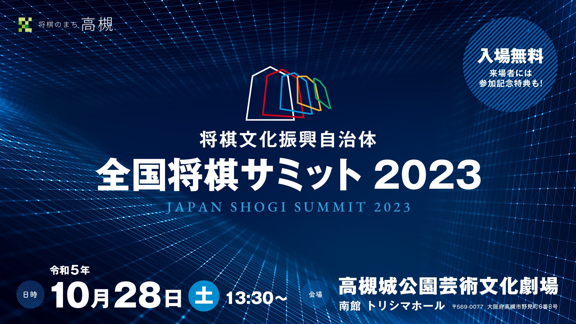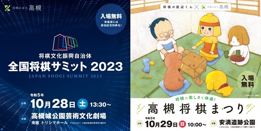 公益社団法人 日本将棋連盟と高槻市が主催する「将棋文化振興自治体 全国将棋サミット2023」は、高槻城公園芸術文化劇場南館トリシマホールで28日(土)13時30分より入場無料で開催されます。羽生善治 九段(日本将棋連盟会長)による記念講演、出席自治体による取組発表に加え、棋士・女流棋士にゲストを加えたトークショー、藤井猛 九段と久保利明 九段による記念席上対局が行われます。