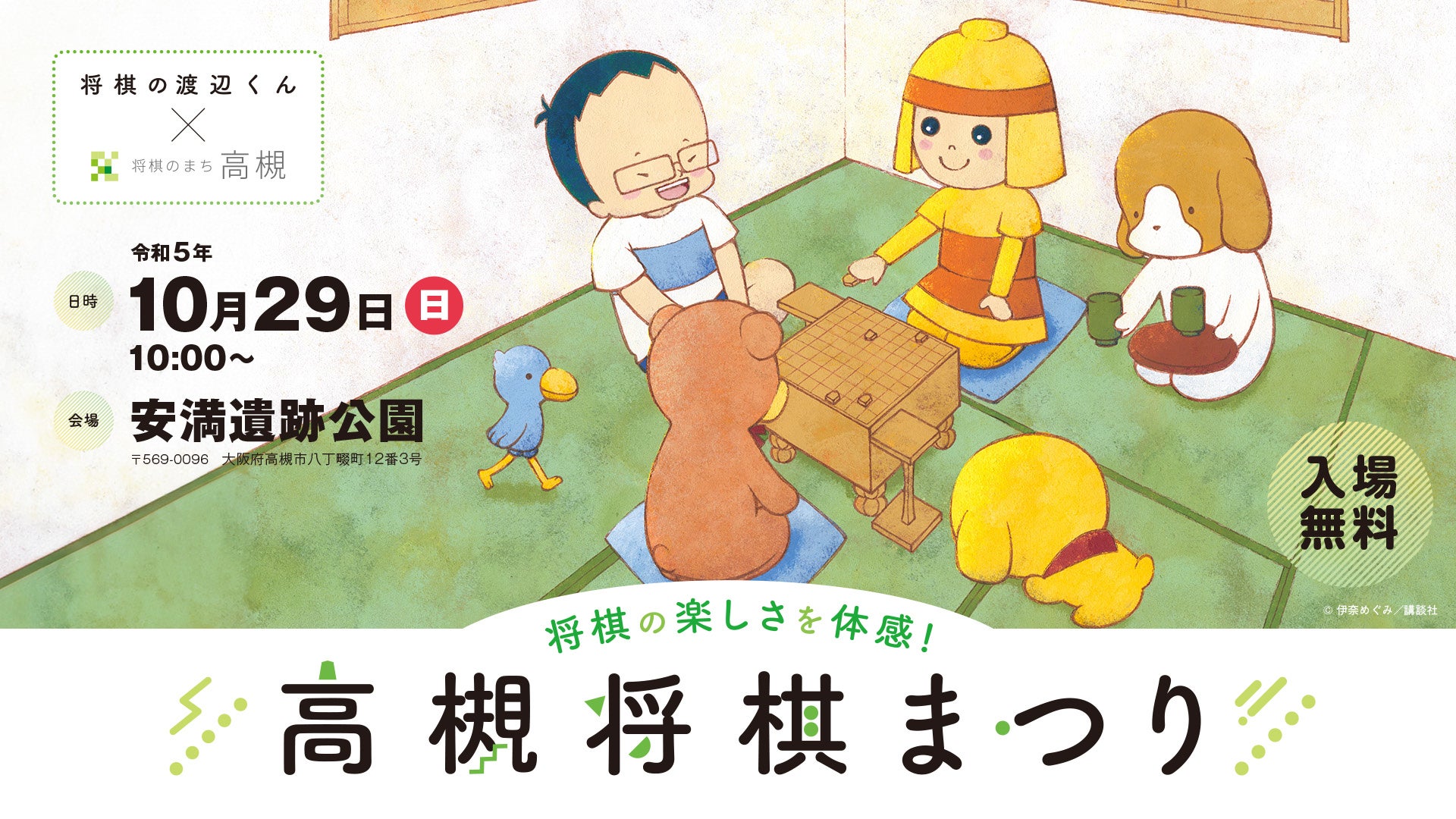 高槻市が開催する「高槻将棋まつり」は、安満遺跡公園(あまいせきこうえん)で29日10時より入場無料で開催されます。参加棋士・女流棋士による公開対局ペアマッチや、2つのトークショーに加え、コミック「将棋の渡辺くん」の著者・伊奈めぐみさんのサイン会や親子指導対局(事前申込制)、高槻将棋ライナーの見学会、「将棋のまち高槻クイズ」(先着でオリジナルグッズプレゼント)等、将棋に関することが盛りだくさんのイベントです。