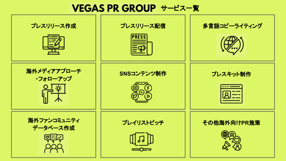2023年1月の設立以降、Vegas PR Groupは大手レーベルやイノベーション企業の国内外のPRプロモーションを担当。わずか半年で、12言語、30以上の国や地域の媒体への掲載実績を上げる。さらに、英語でのニュース掲載に加え、海外メディアへのインタビュー掲載調整や海外イベント・コンサートブッキングまで、クライアントの皆様の多様なニーズに応えるサービスを展開しています。主な提供サービスは以下のとおりです。