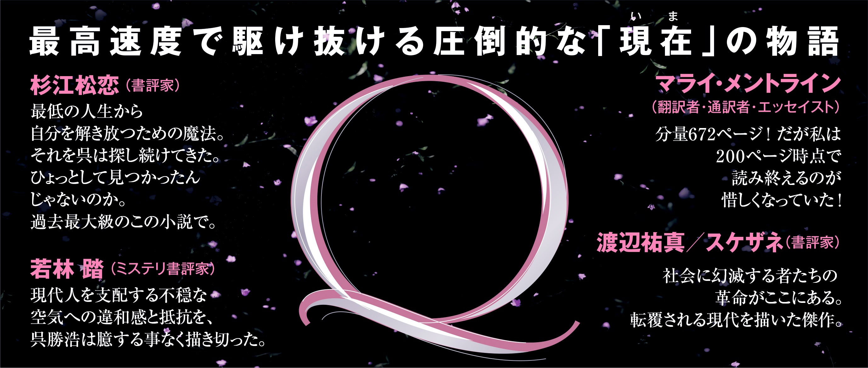 呉勝浩の最新作『Q』の特設サイトで、いよいよ書影を公開します。イラストはPOOLさんによるものです。また、「本読みのプロ」から寄せられたコメントを紹介! 3作品連続で直木賞候補にあげられている著者史上最大巨編を、いよいよ11月8日に小学館より刊行します。刊行に先立って読んでいただいた全国の書店員さんの声も順次公開。お楽しみください。