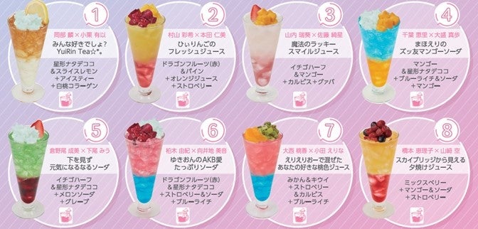 AKB48 62nd Single「アイドルなんかじゃなかったら」表題楽曲の選抜メンバーそれぞれのペアをイメージしたコラボドリンク8種[各750円(税込)ノンアルコール]をご用意しました。