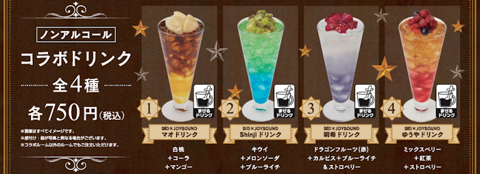 コラボドリンクには、シドのメンバー「マオ」「Shinji」「明希」「ゆうや」をイメージした全4種をご用意します。