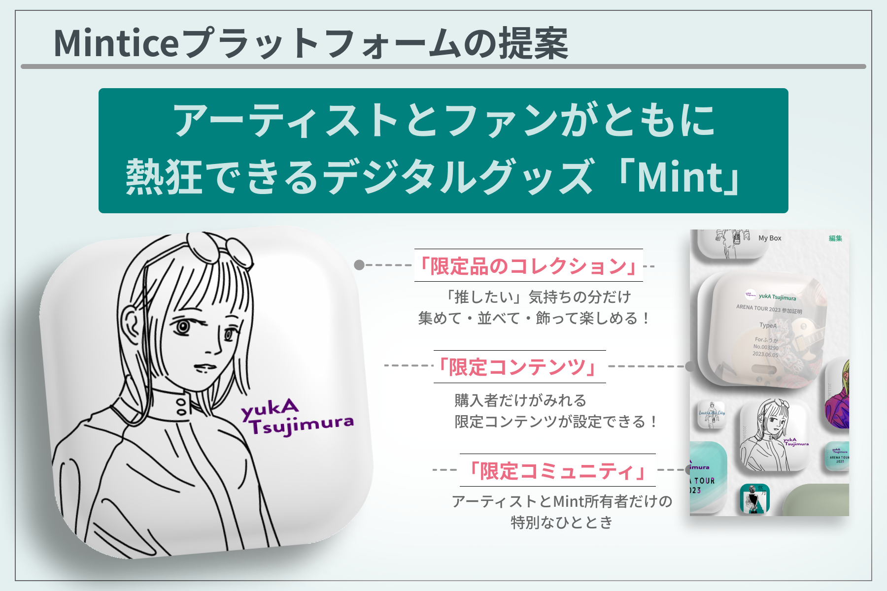クリエイターやイベンターが、記念日やイベント等を記念して期間限定で販売するデジタルグッズ「Mint」を、ファン向けに提供できるプラットフォーム。「Mintice」を通じて、イベントや記念日の盛り上がりの総量を増やすことを目指します。