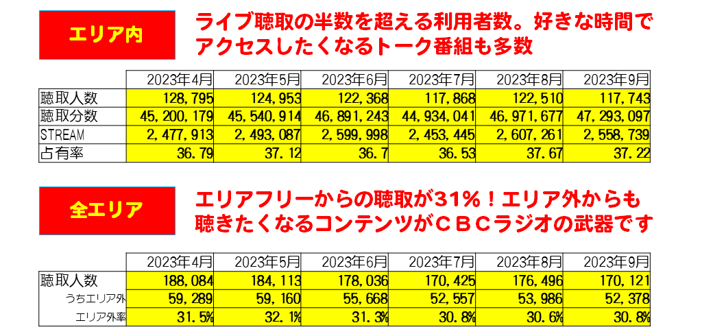 CBCラジオは、2023年度上半期(同年4月から9月の6ヶ月間)で、愛知・岐阜・三重の中部3県全10局において、ライブ(リアルタイム聴取)/タイムフリー(放送後1週間以内のアーカイブ聴取)/トータルの聴取者数・聴取者占有率・STREAM(再生数)においてエリア1位を獲得しました。