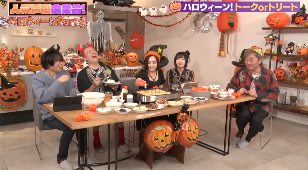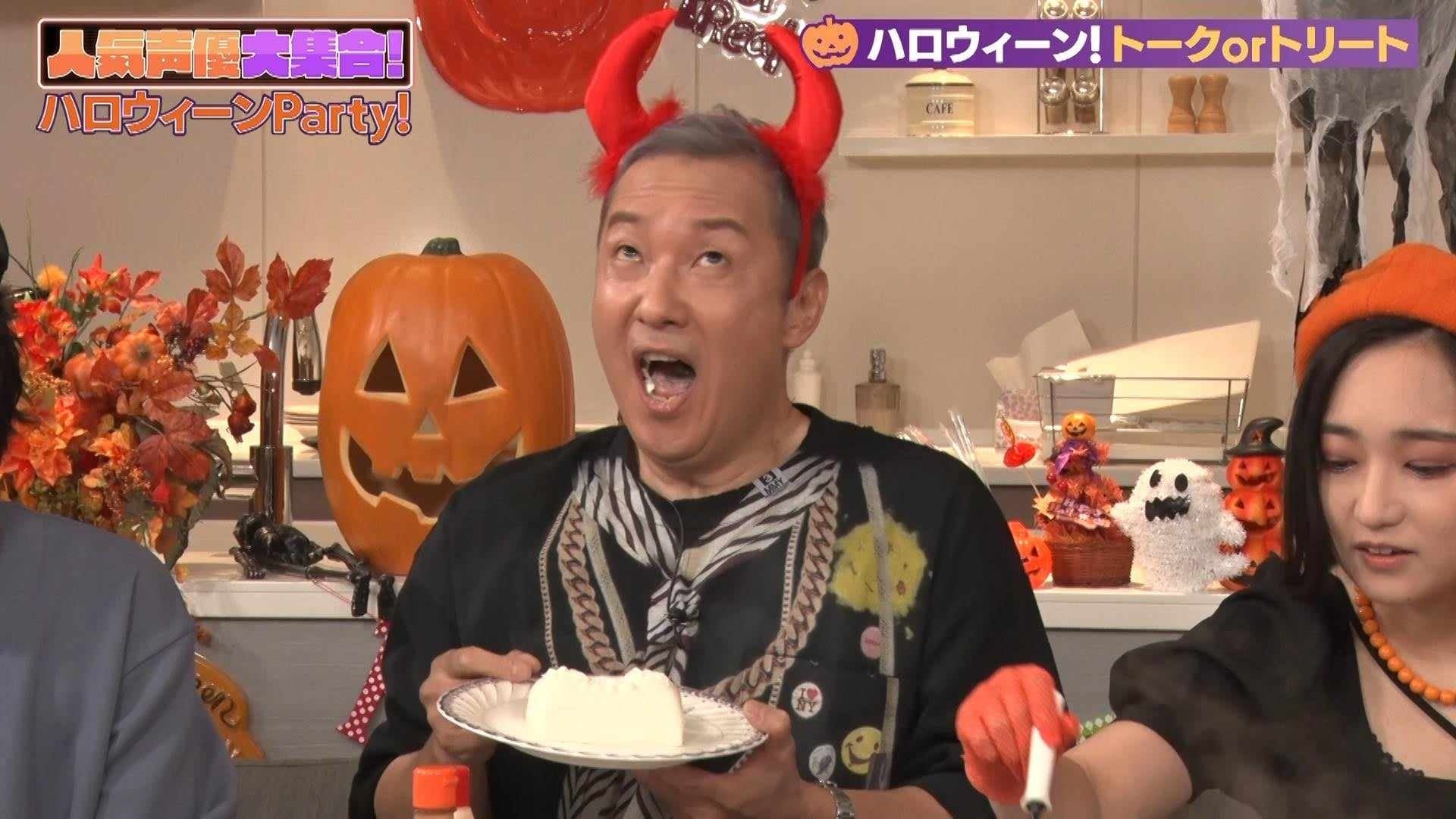 スタジオでは、出演者がお題に答える「ハロウィーン!トーク or トリート!」を展開。ハロウィーンらしく、小さなカボチャを引くとトークテーマや指示書が入っており、それぞれ答えていくというルールで進行しました。トップバッターの阪口さんが引いた質問は「仕事でヒヤリとしたこと」で、阪口さんは「当時35歳くらいの時に60代くらいの農夫の役を演じたこと」と回答。ゲストから「今、再現して!」と無茶ぶりされたり、「50歳の前髪にみえない」と視聴者にコメントされるなど、いじられる結果に。続いて「自分が声優として成功していると思った瞬間」というお題には、佐倉さんは「自身の通う大学の授業で、自分が出演したアニメの話題が出た時」と回答。他のメンバーからも「それは確かに、成功だ!」と満場一致の意見となりました。また、スイーツをもらえる”当たりカボチャ”を引いた小野坂さんは食レポにチャレンジ。MCの小沢さんを前に、全力で「あまーーーーーい!」と絶叫し、スタジオも、コメント欄も大盛り上がりとなりました。