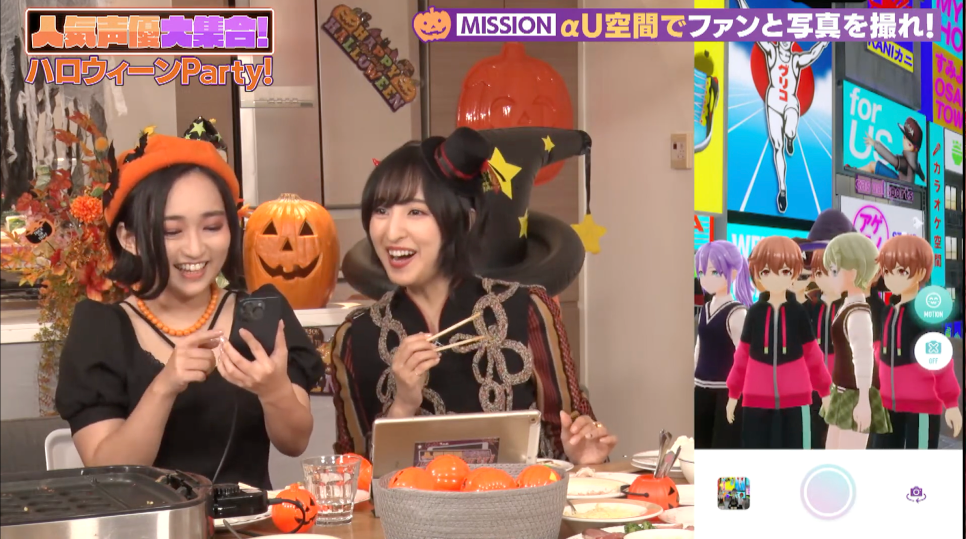 今回のトークイベントでは、「αU metaverse」をゲスト全員で体験してみました。ハロウィーンコスチュームを身に纏った特製アバターで、まずはバーチャル大阪に降り立つと、大阪出身の小野坂さんが自称・方向音痴の悠木さんを優しく道案内。観光名所のグリコ前に着くとそこにはファンたちもアバターとなって大集合していました。さっそく参加者との記念撮影を試みる悠木さんは「すごいゼロ距離ですね!」とバーチャルならではの距離感を楽しんでいる様子でした。続いて、バーチャル渋谷へ移動した悠木さんは「メタバースでも、映えないと!」とSHIBUYA109のロゴを上手に画面に映り込ませながら、アバターになったファンたちと共に記念撮影を行いました。