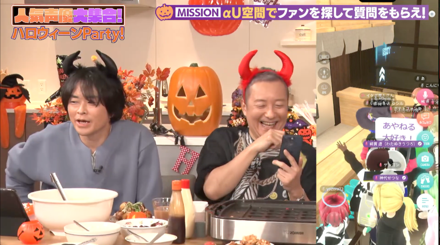 人気声優大集合!ハロウィーンParty」では、スピードワゴン・小沢一敬さんをMCに迎え、小野坂昌也さん、悠木碧さん、佐倉綾音さん、阪口大助さんが声優ならではのトークだけでなく、メタバースアプリ「αU metaverse」のバーチャル渋谷と大阪に繰り出して、参加者と会話したり、記念撮影を行うなど、バーチャルならではの交流に挑戦する生配信番組です。
