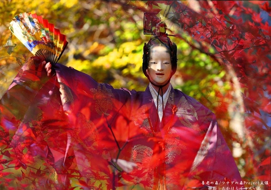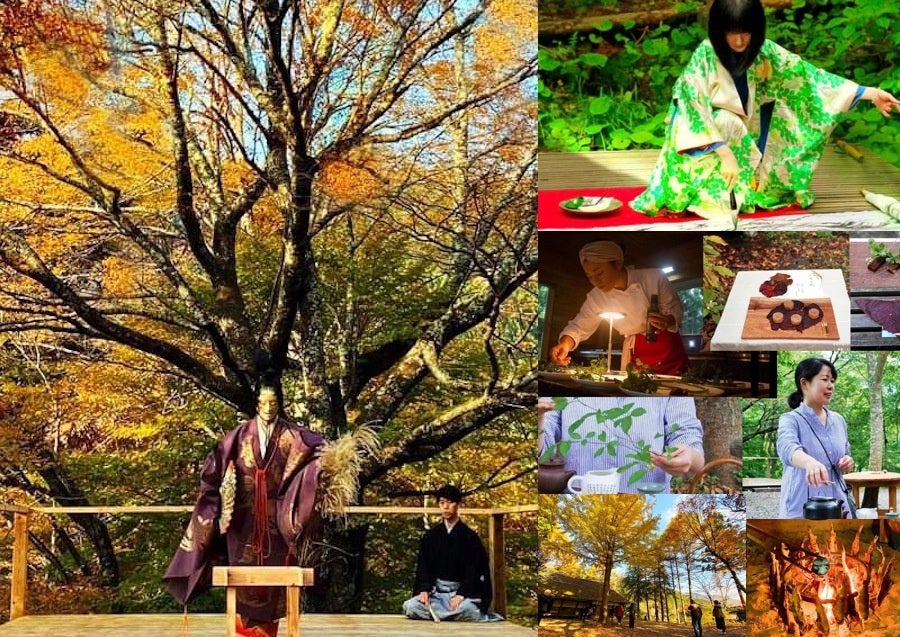 美しい紅葉の森の千手桜舞台にて能「紅葉狩」のご鑑賞やワークショップ、お茶会や墨絵など楽しむ二日間。