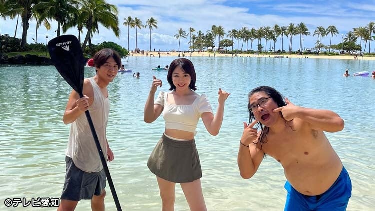 ハワイに住んだら毎日アクティブに過ごしたい!3人はホテルの宿泊者ではなくても利用できる人工ラグーンでハワイ発祥のSUPを体験!ラグーン1周コースを競争することにした3人だったが、中岡に今後のロケが心配されるアクシデントが発生!