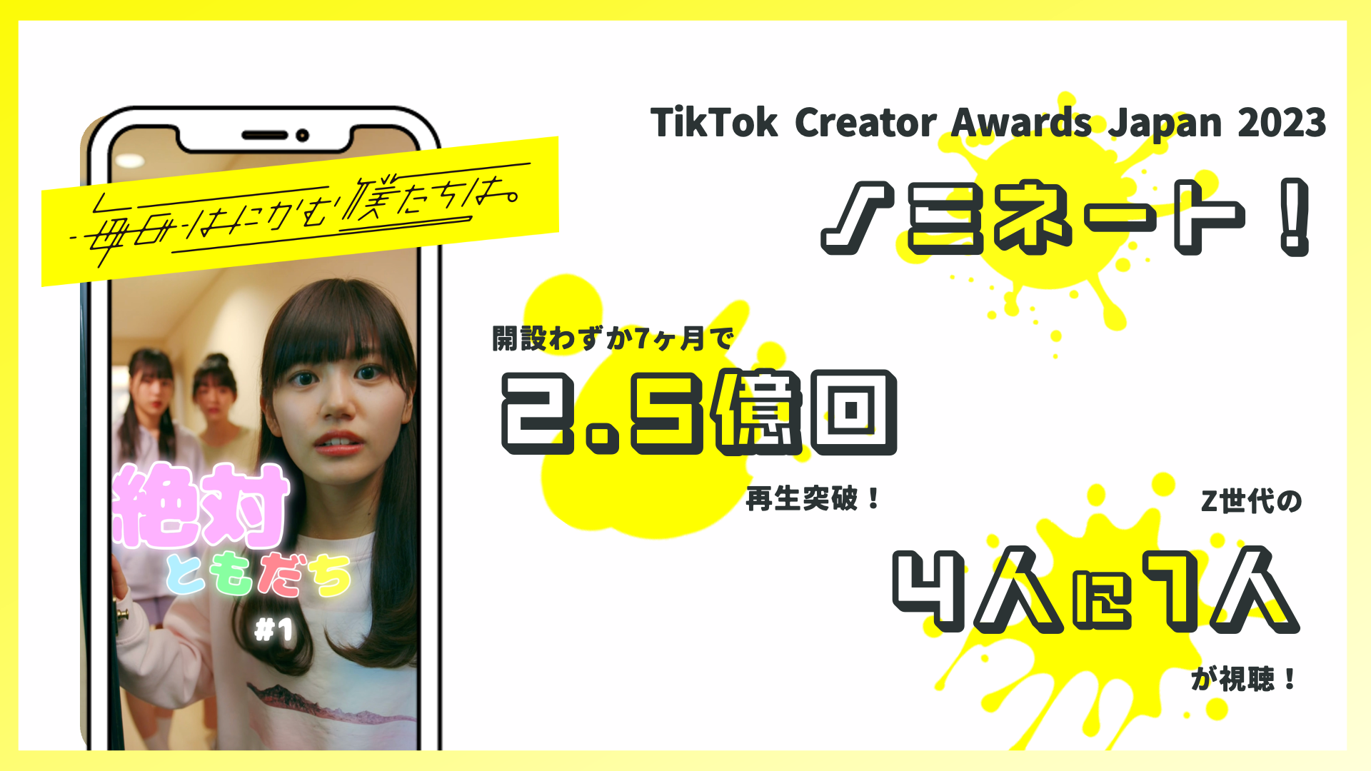 若い世代を中心に多くの方々に、ご覧いただいている中でこの度、TikTokによる厳正なる審査の結果、12月に開催されるTikTok Creator Awards Japan 2023「Drama Creator of the Year」部門においてノミネートされたことをお知らせ致します。日々、ご視聴いただいている皆様へ心より感謝申し上げます。