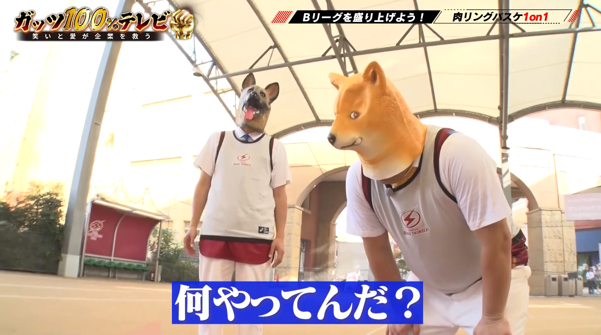 最初の対決は『ガッツ肉リングバスケ 1on1』。2対2でペアを作り、チーム内で「プレイヤー」と「肉のリング(体でリングを作る)」のポジションに分かれます。ダンクを決めたら得点。先に2得点をあげたチームが勝利となります。また、得点が決まると、川崎ブレイブサンダースのチアリーダーズ「IRIS(アイリス)」が、ゴールセレブレーションのパフォーマンスを披露! 得点を許したチームは動物のマスクをかぶらされ、見ることができません。