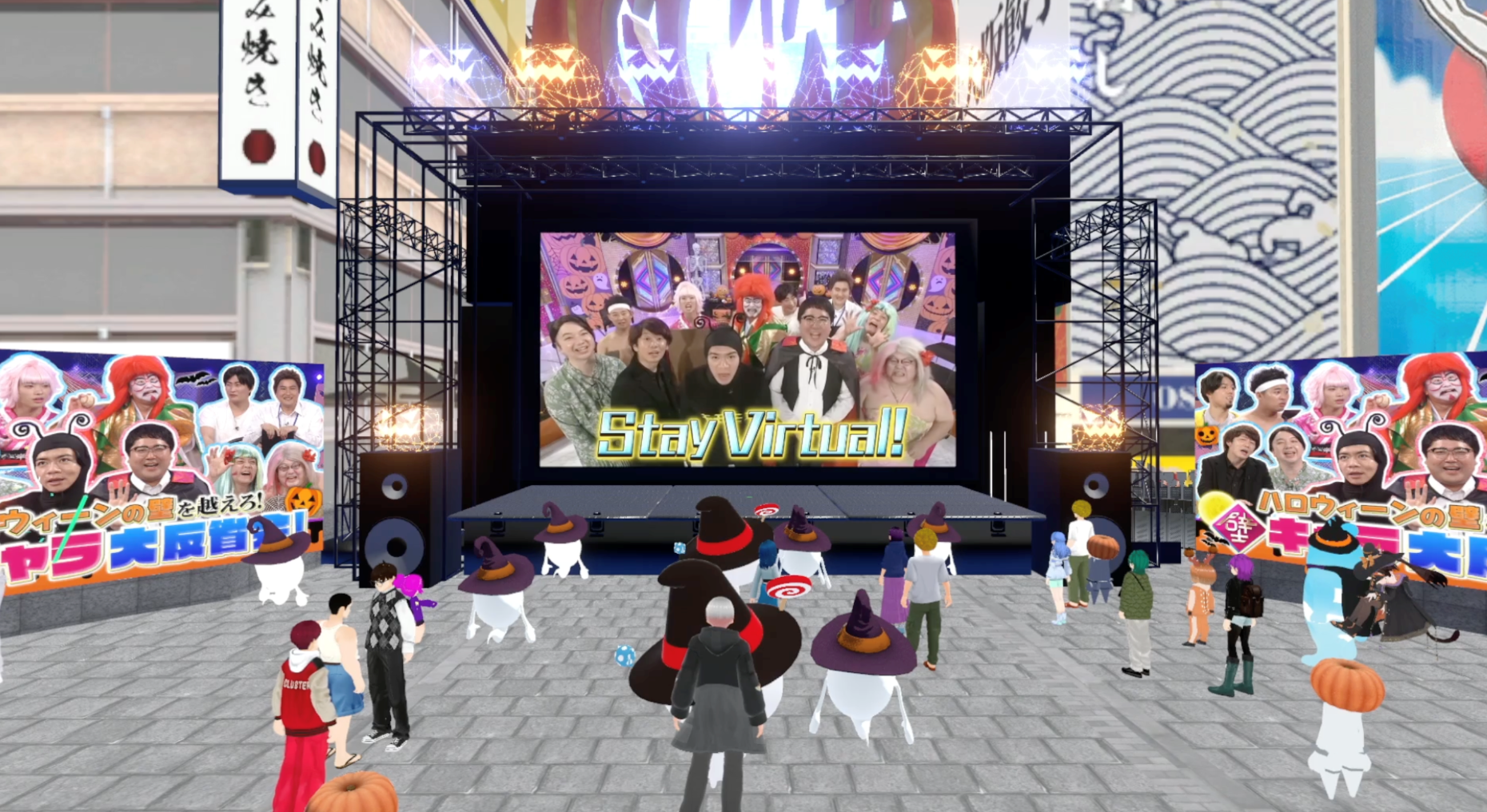 バーチャルハロウィーンと人気バラエティ番組がコラボレーション。ハロウィーンの夜を”笑い”で彩る特別編に人気芸人のとにかく明るい安村さん、マヂカルラブリーさん、三四郎さん、四千頭身さん、タイムマシーン3号さん、きつねさんが登場。懐かしのキャラたちが大集合して行われた”壁反省会”をαU YouTubeチャンネル、バーチャル大阪で配信しました。また翌日の10月29日には「トークライブ延長戦」と銘打ち、マヂカルラブリー・野田クリスタルがバーチャル渋谷と大阪を散策。参加者からの「筋肉悩み相談」を受けたり、記念撮影をする等盛り上がりました。
