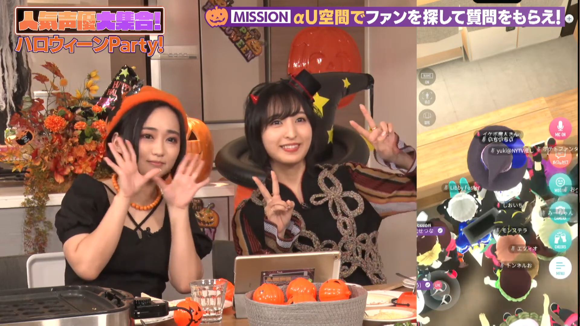 スピードワゴン・小沢一敬さんをMCに迎え、人気声優の小野坂昌也さん、悠木碧さん、佐倉綾音さん、阪口大助さんが声優ならではのトークだけでなく、メタバースアプリ「αU metaverse」のバーチャル渋谷と大阪に繰り出して、参加者と会話したり、記念撮影を行うなど、バーチャルならではの交流に挑戦しました。バーチャル渋谷内にある居酒屋にて、ファンと質問コーナーをしたところ、悠木さんと佐倉さんも知っている声優のイラストを描いているというファンを発見。「今一番誰を描きたい?」と質問すると、ファンは「ハロウィーン姿の2人を描きたい」と回答。すかさず佐倉さんは「盛って描いてほしいー!」とノリノリでリクエストされていました。