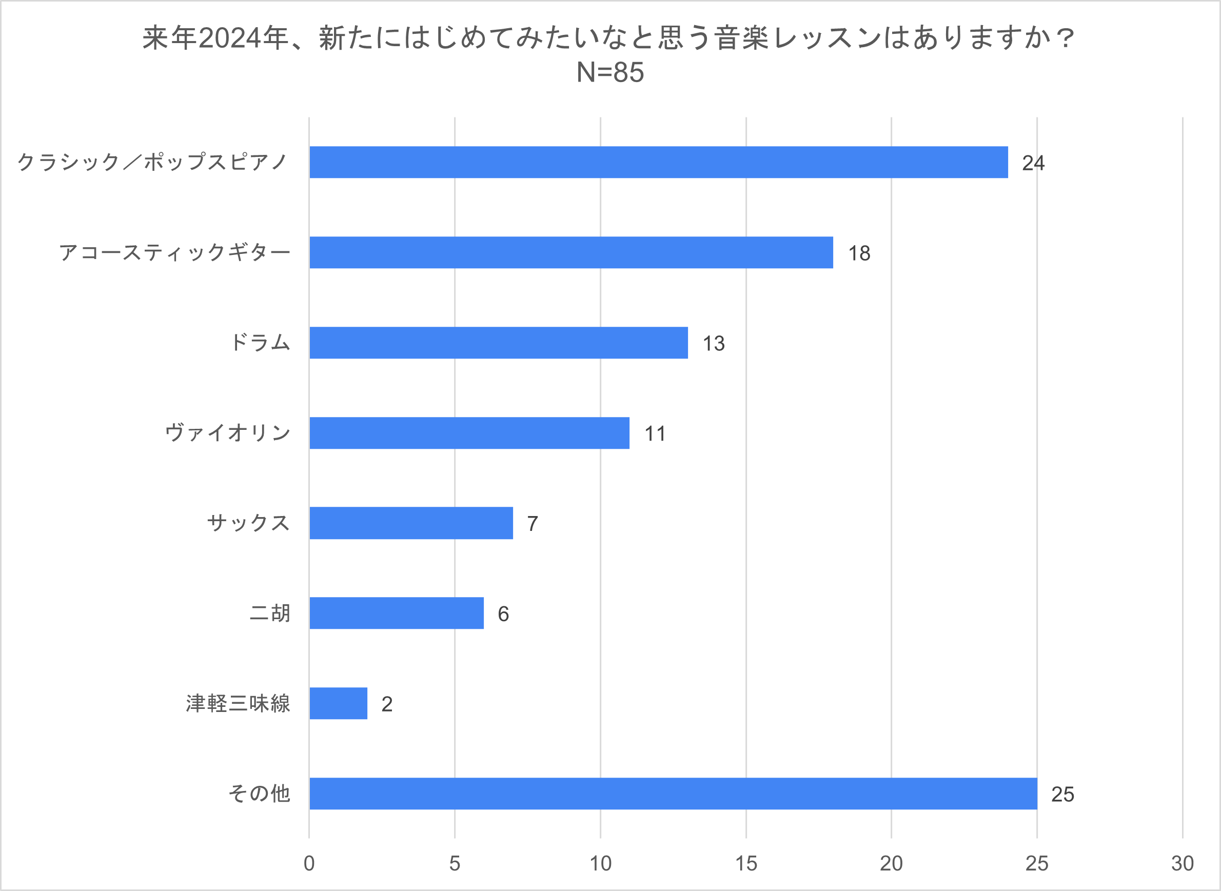 また、そんな歌好きの生徒が2024年から心機一転、楽器のレッスンをはじめるとしたら何に取り組むのか質問したところ、1位は「クラシック/ポップスピアノ」(回答数24)となった。2位には「アコースティックギター」(回答数18)。
