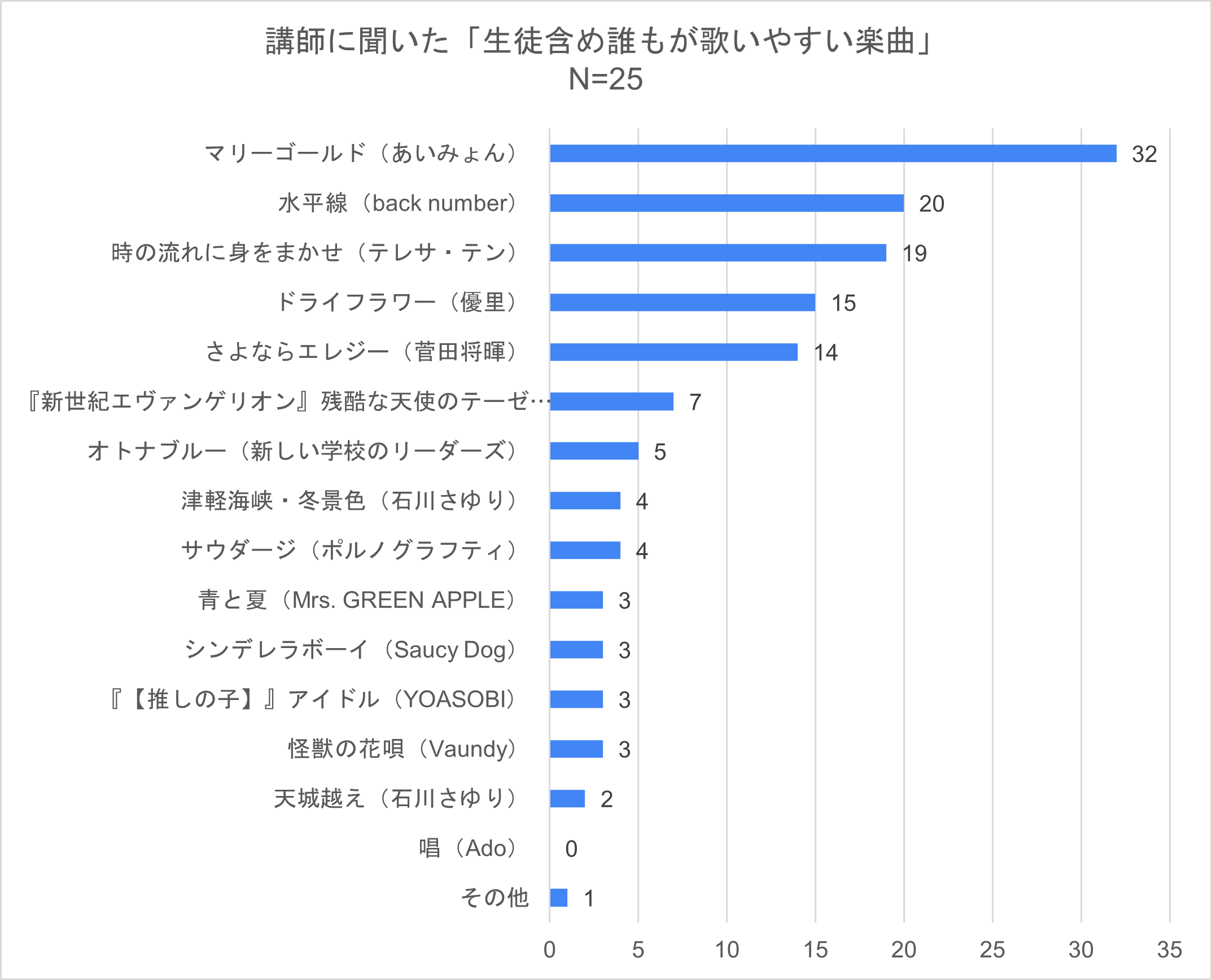 同様の選択肢を元に、講師に対して「「DAM 2023年上半期カラオケランキング」ベスト10・最新月間ランキングの以下の中で、生徒含め誰もが歌いやすい曲を先生目線で教えてください(複数回答可)」という質問に対して1位は生徒の回答同様「マリーゴールド(あいみょん)」(回答数32)となったことから、誰もが認める、歌いやすい楽曲の定番と言えそうです。