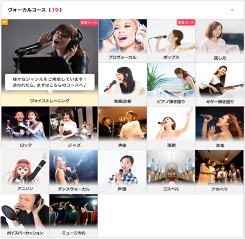 それぞれのカテゴリごとに全国から選りすぐりの講師を揃え、ご自身のレベルや希望、性格にまで合わせた相性の良い最適な講師をご提案します。上達保証カリキュラムや無料体験レッスンなど、ボーカルレッスンが初めての方でも安心して受講頂けるサポートも充実しています。