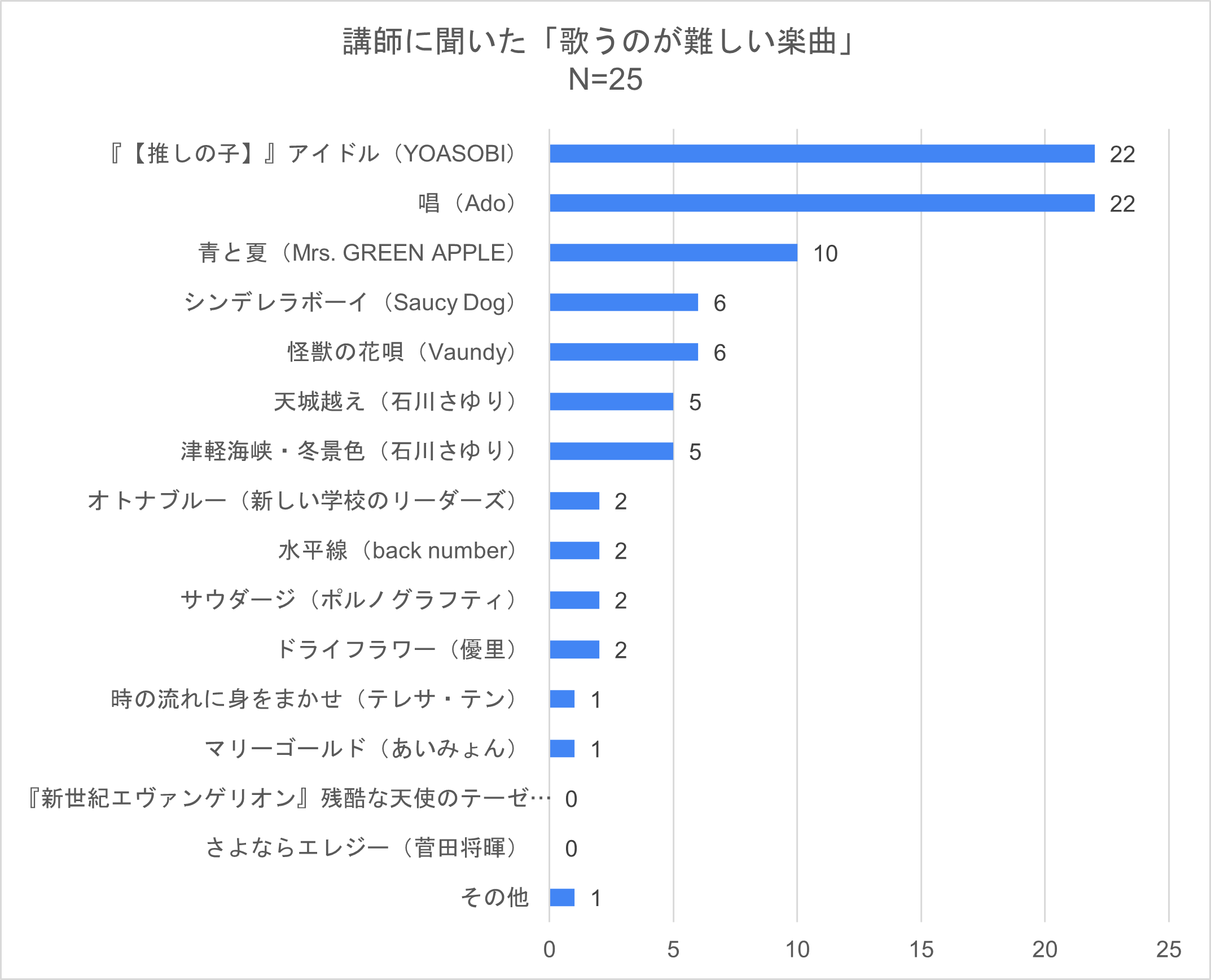 講師に聞いた最も難しい曲は同率一位で「『【推しの子】』アイドル(YOASOBI)」「唱(Ado)」