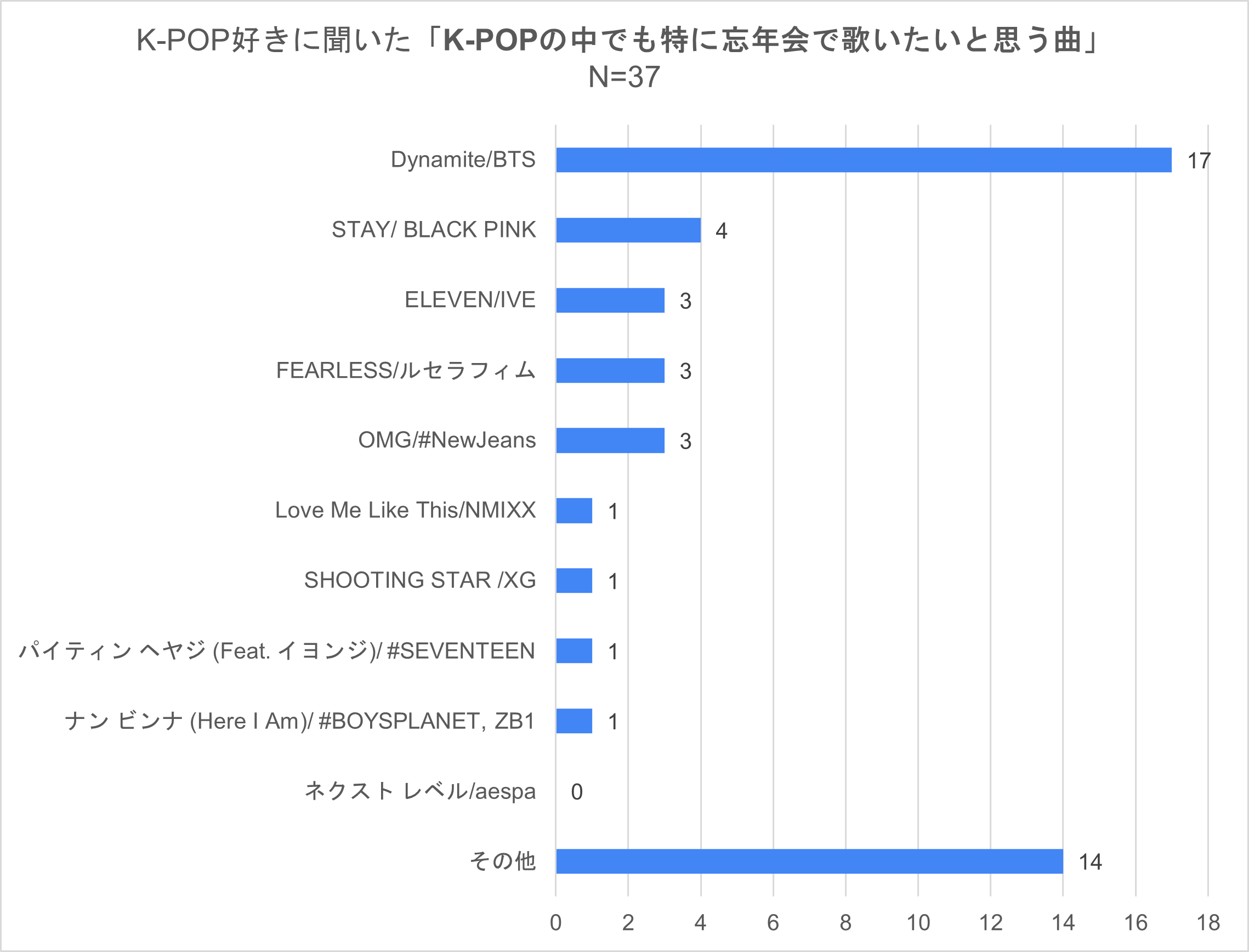アンケートに回答した生徒の内、K-POPが好きと回答した37名に「K-POPの中でも特に忘年会で歌いたいと思う曲(選択は一例)はどれですか?」という質問をしたところ、2位と大きく差をつけて「Dynamite/BTS」(回答数17)が1位となった。2位は「STAY/ BLACK PINK」(回答数4)3位は同率で回答数3の「OMG/#NewJeans」「FEARLESS/ルセラフィム」「ELEVEN/IVE」が並んだ。