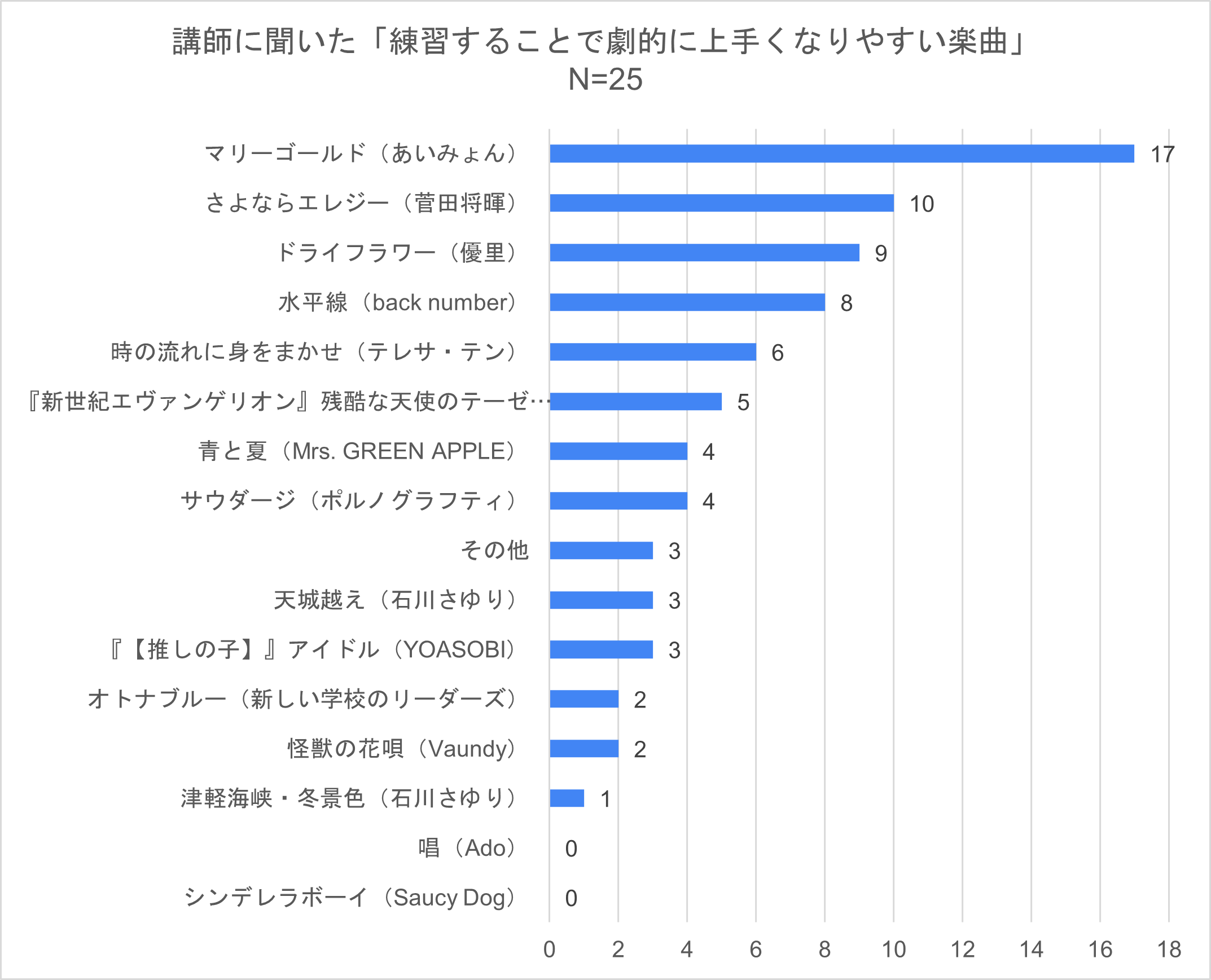 同様の選択肢の中において「劇的に上手くなる」曲についても講師に質問した。その結果、1位は「マリーゴールド(あいみょん)」(回答数17)、2位「さよならエレジー(菅田将暉)」(回答数10)、3位「ドライフラワー(優里)」(回答数9)という結果に。共通してバラードの楽曲が上位となる結果となった。