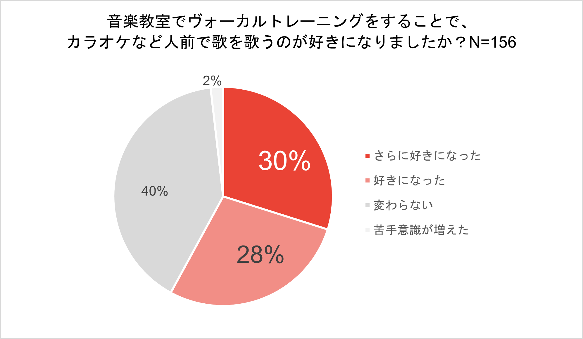 普段ボーカルレッスンを行う生徒の満足度についても調査を行った。「音楽教室でボーカルトレーニングをすることで、カラオケなど人前で歌を歌うのが好きになりましたか?」という質問に対して、「さらに好きになった」(29.9%)、「好きになった」(28%)となり半数以上を占める57.9%がボーカルレッスンを通じて歌が好きになっていることが明らかになった。