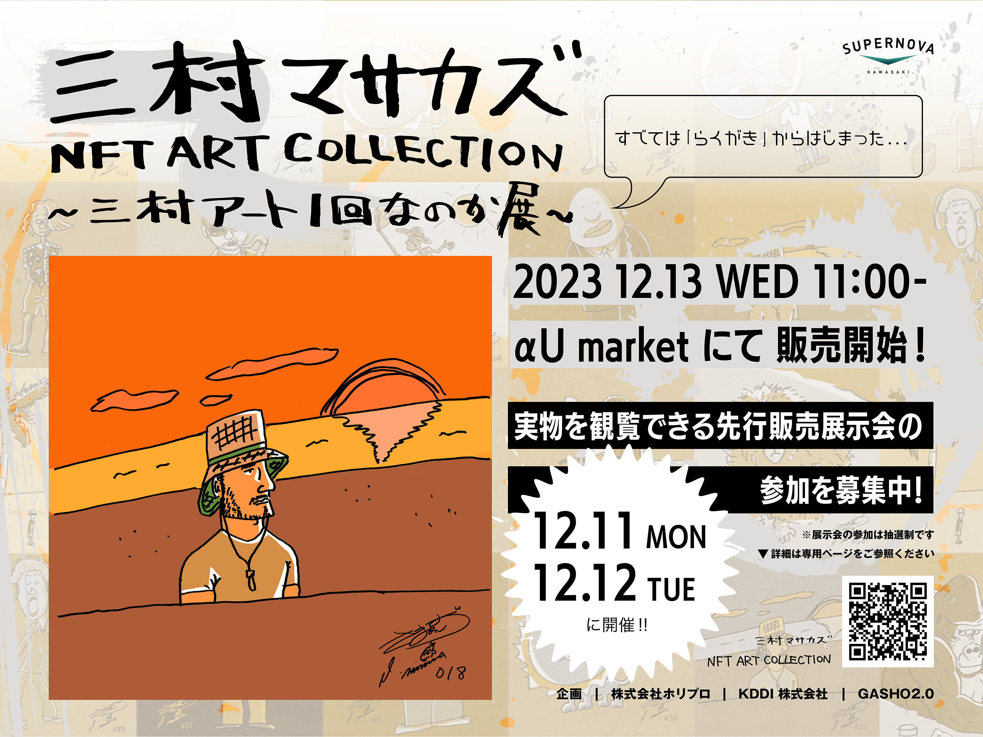 GASHO2.0(運営:株式会社Raptors)は、株式会社ホリプロとKDDI株式会社と3社連携し、NFTマーケットプレイス「αU market」において、お笑い芸人・さまぁ~ずの三村マサカズさんのアート作品100点のNFTを12月13日より発売することが決定しました。今回は三村さんが書き下ろしたアート作品14種類をNFT化したデジタルアートだけでなく、独自の製造技術によって”2.5次元”で楽しめるMetal Canvas Artとのセット販売になり、リアルでもデジタルでも作品を楽しむことができます。