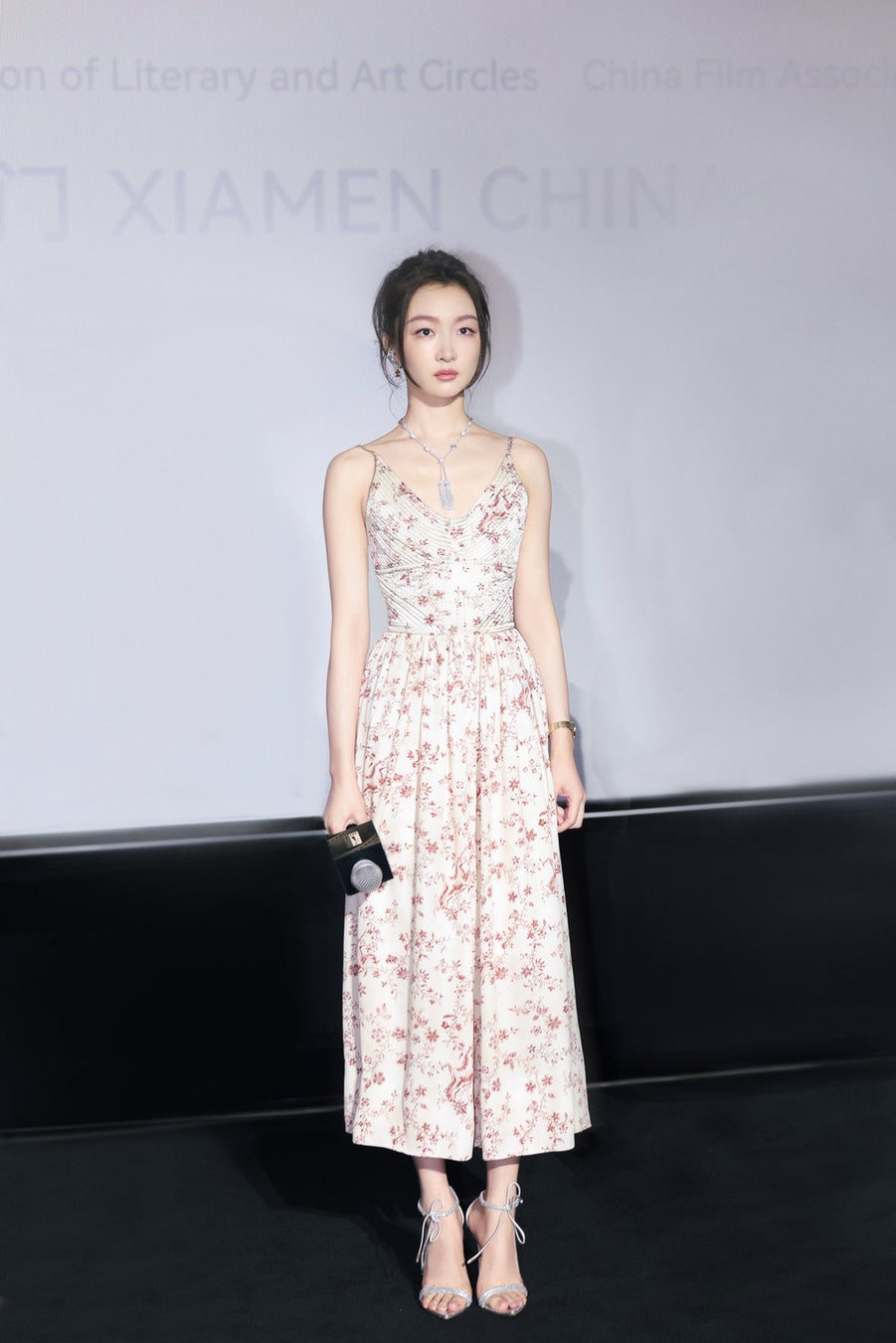ジン·チェンは、ブルーのグラフィックプリントをあしらったホワイトのノースリーブAラインギャバジンドレスとブラックのレザーサンダルを合わせ、また、ルイ·ヴィトンのファインジュエリーコレクションより、ホワイトゴールドとダイヤモンドのルイ·ヴィトン ブロッサムのペンダントとリングを着用しました。