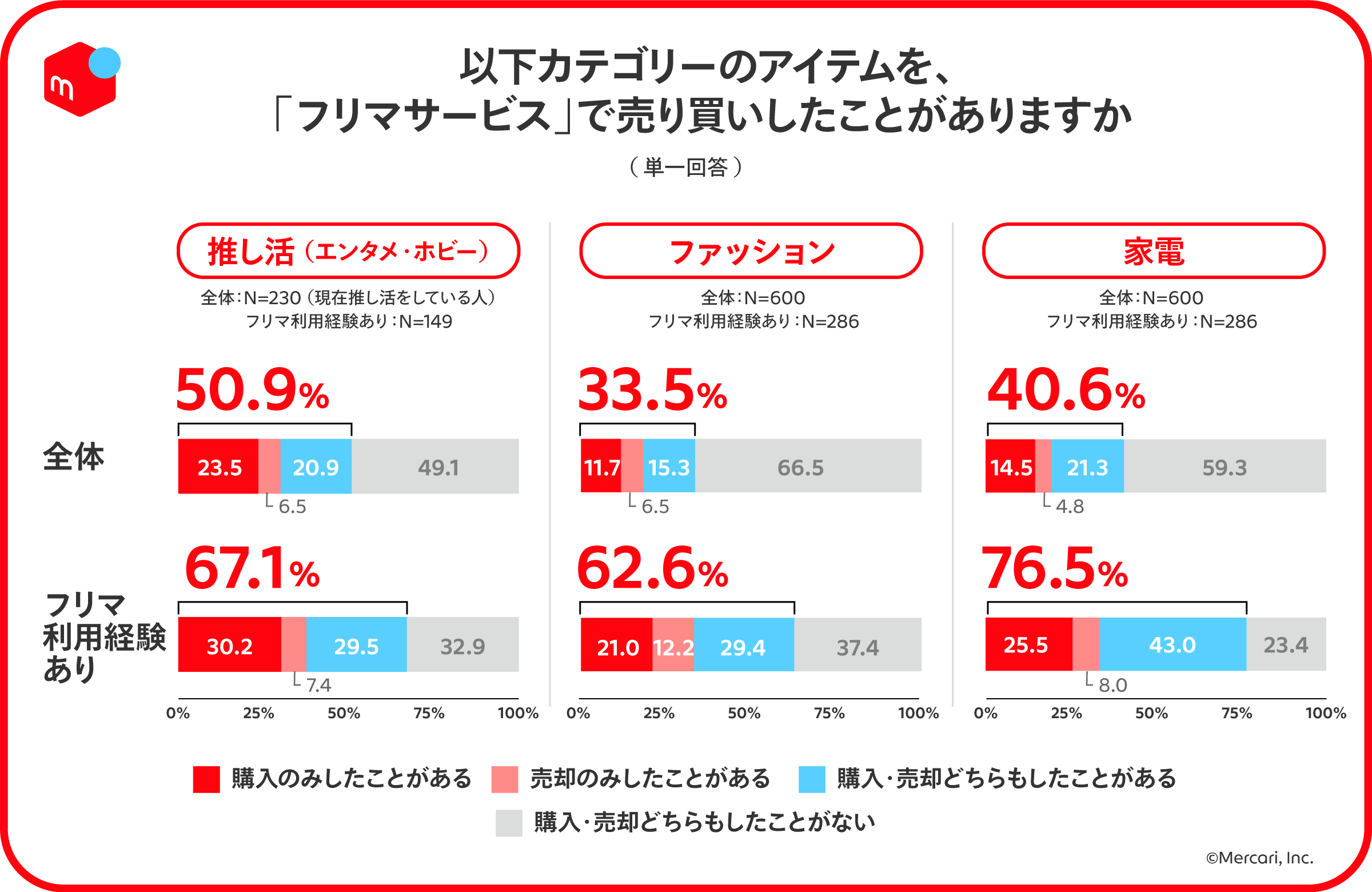一方、過去フリマサービスを利用したことがある層のみに絞って同じ質問をしたところ、「推し活(エンタメ・ホビー)」においては約7割(67.1%)が、「ファッション」においては約6割(62.6%)が、「家電」においては約8割(76.5%)が、取引を行ったことがあると回答しました。それぞれ、約1.3倍、約1.8倍、約1.8倍と、フリマサービス利用者にとって、この3カテゴリーはフリマサービス利用の主要な利用例となっていることが分かりました。