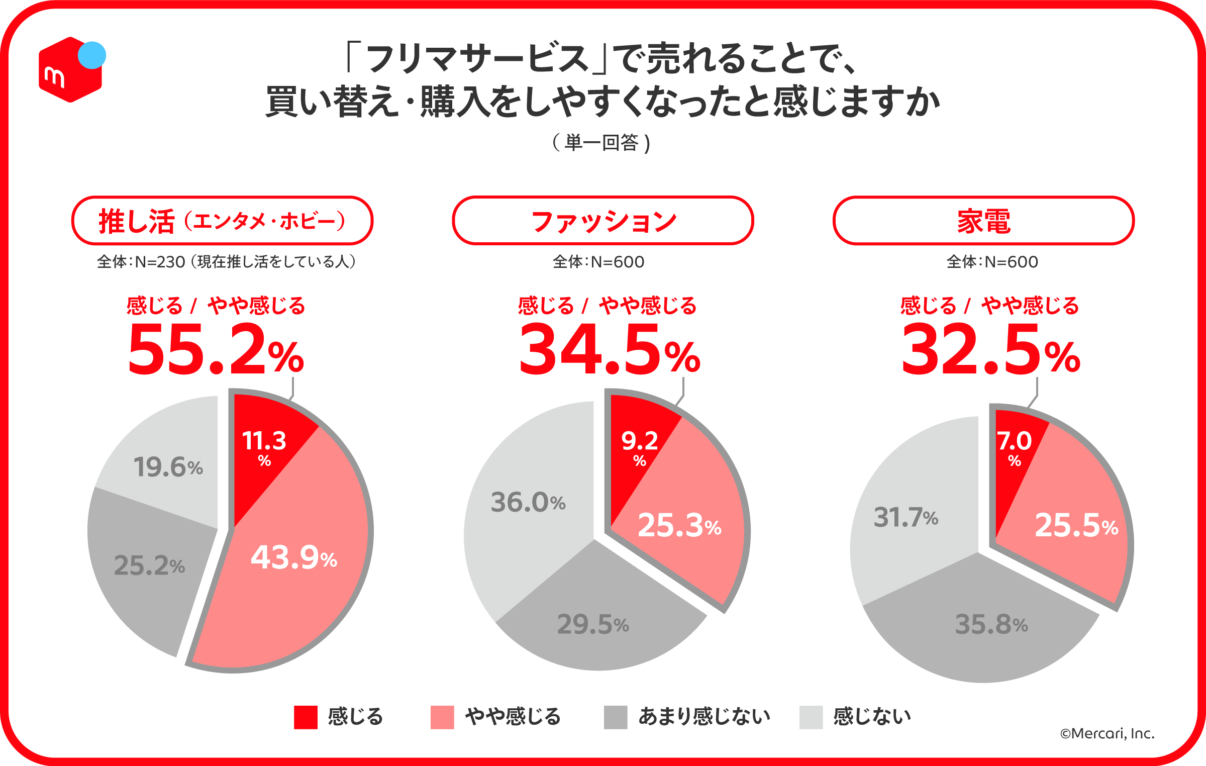 さらに、「フリマサービスで売れることで、買い替え・購入をしやすくなったと感じるか」については、「推し活(エンタメ・ホビー)」で半数以上(55.2%)、「ファッション」で3割以上(34.5%)、「家電」でも3割以上(32.5%)と、各カテゴリーで、フリマサービスが一定の層の買い替え・購入意欲を促進していることがわかりました。