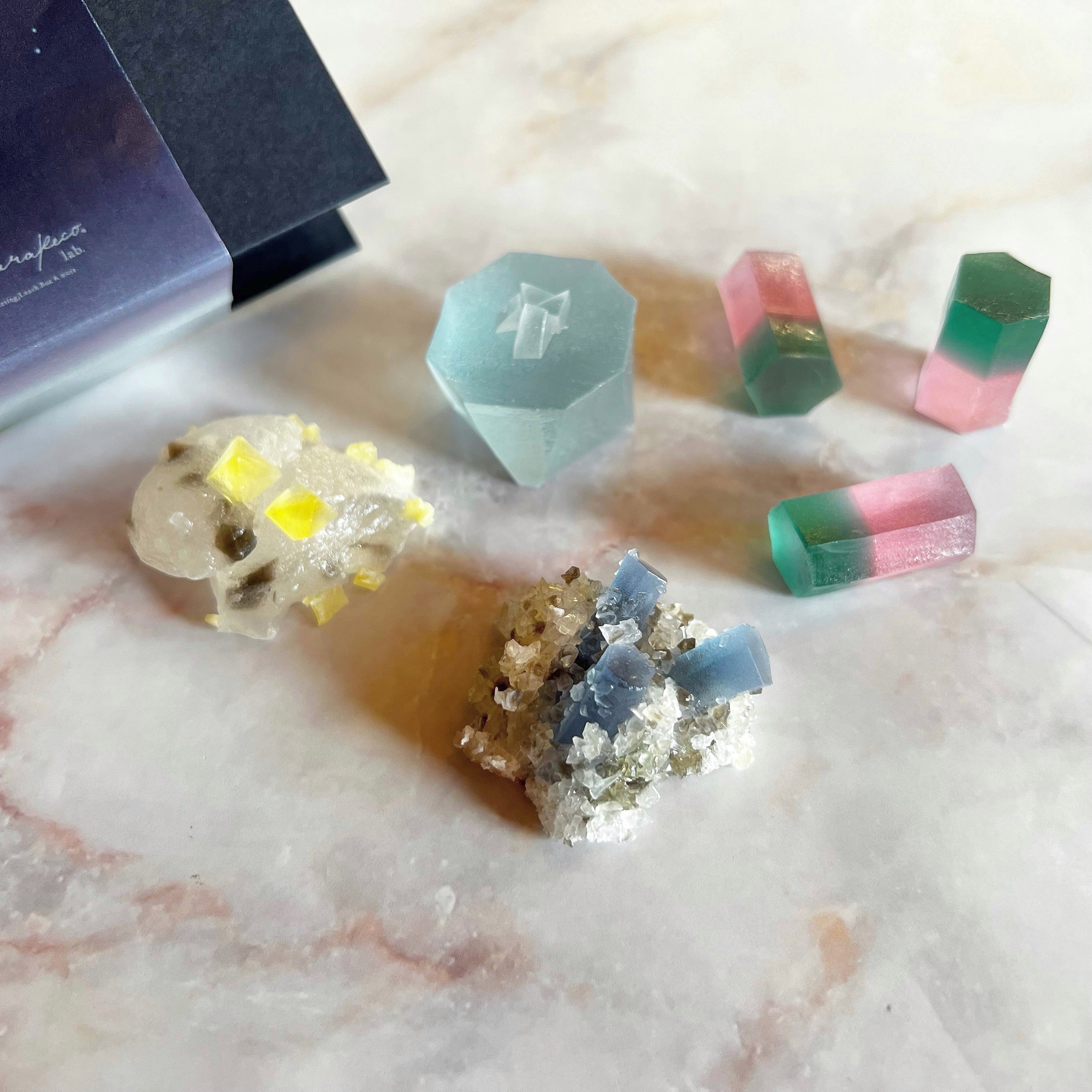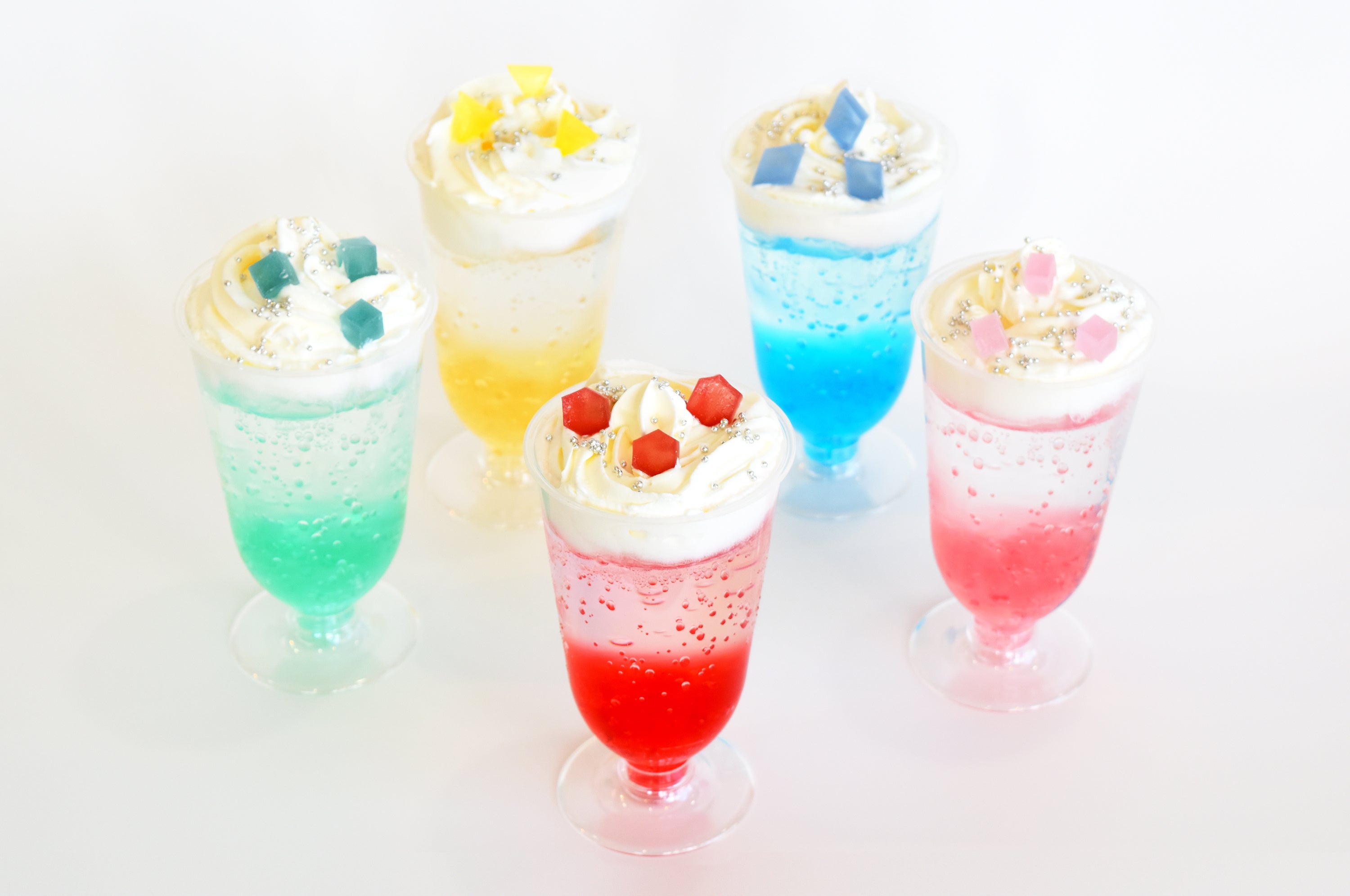 5 つの天然石カラーのジェリーサイダー。 ハラペコラボの「こうぶつのカケラ」をトッピングしました。