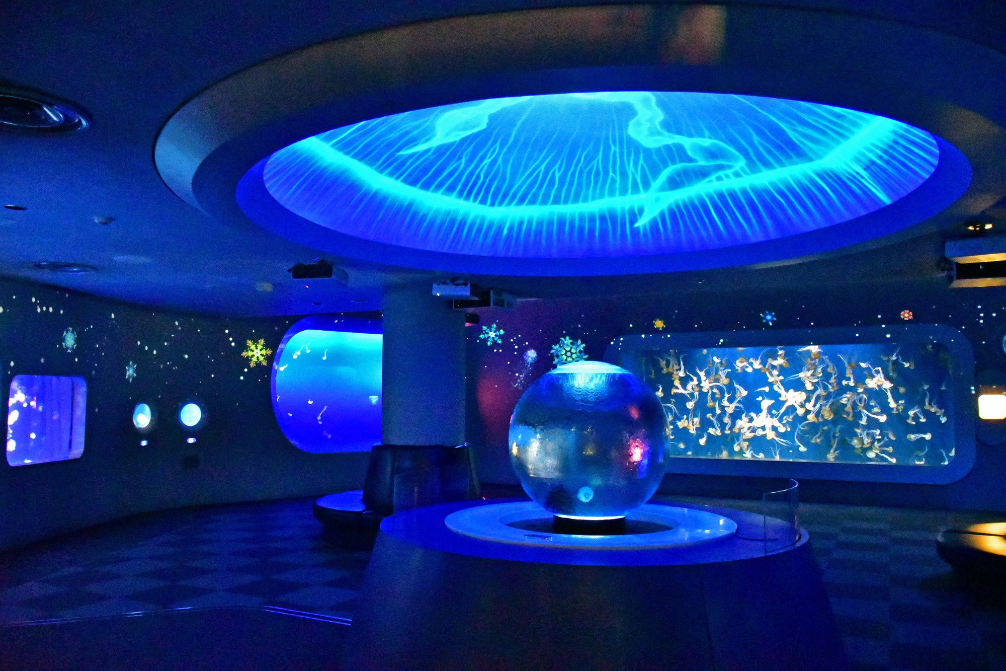 クラゲだけの幻想空間「クラゲファン タジーホール」の壁一面を、宝石の結晶とクリスタルクラゲが華やかに彩ります。
