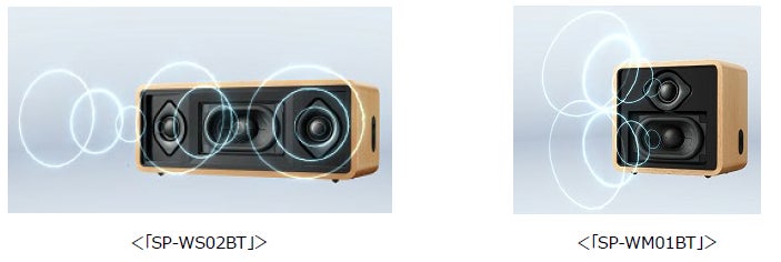 両モデルともフロントにウーファーとシルクドームツィーター、リアに大型パッシブラジエーターを搭載した2ウェイ・スピーカー構成を採用、小型ながら上質なサウンドと豊かな音楽空間を実現。「SP-WS02BT」は、左右にツィーターを配置し、クリアな中高域と重厚な低音のステレオ再生が可能。「SP-WM01BT」は、豊かな低音と広い音楽空間を実現します。