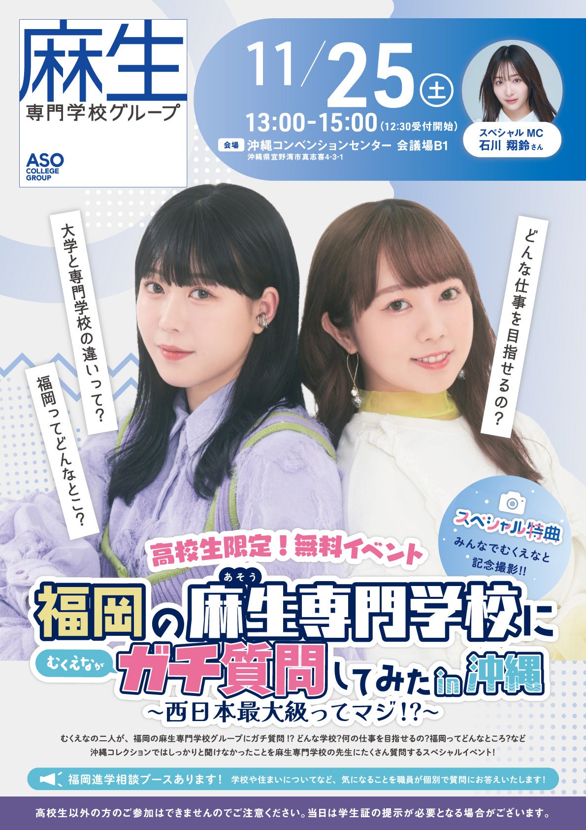トークショーや麻生専門学校紹介コーナー、充実した福岡生活をお伝えるプログラムなど、高校生のみなさんが、福岡県や麻生専門学校グループへの進学を検討する際に役立つ情報を手に入れる機会を提供します。また、ゲストと参加者全員での集合写真撮影企画も!お席に限りがございますので、お申し込みはお早めに!(参加無料&要予約)