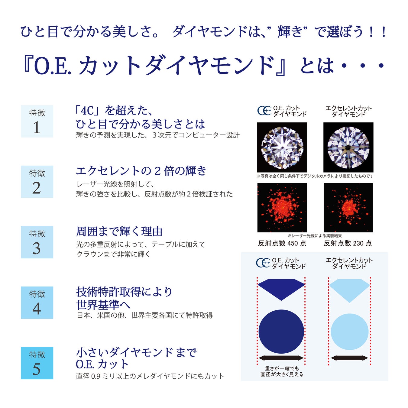 「O.E.カット」は、ダイヤモンドが持つ美しさを最大限に引き出すために、世界に先駆けて株式会社ほほえみブレインズが開発した新しいカットです。