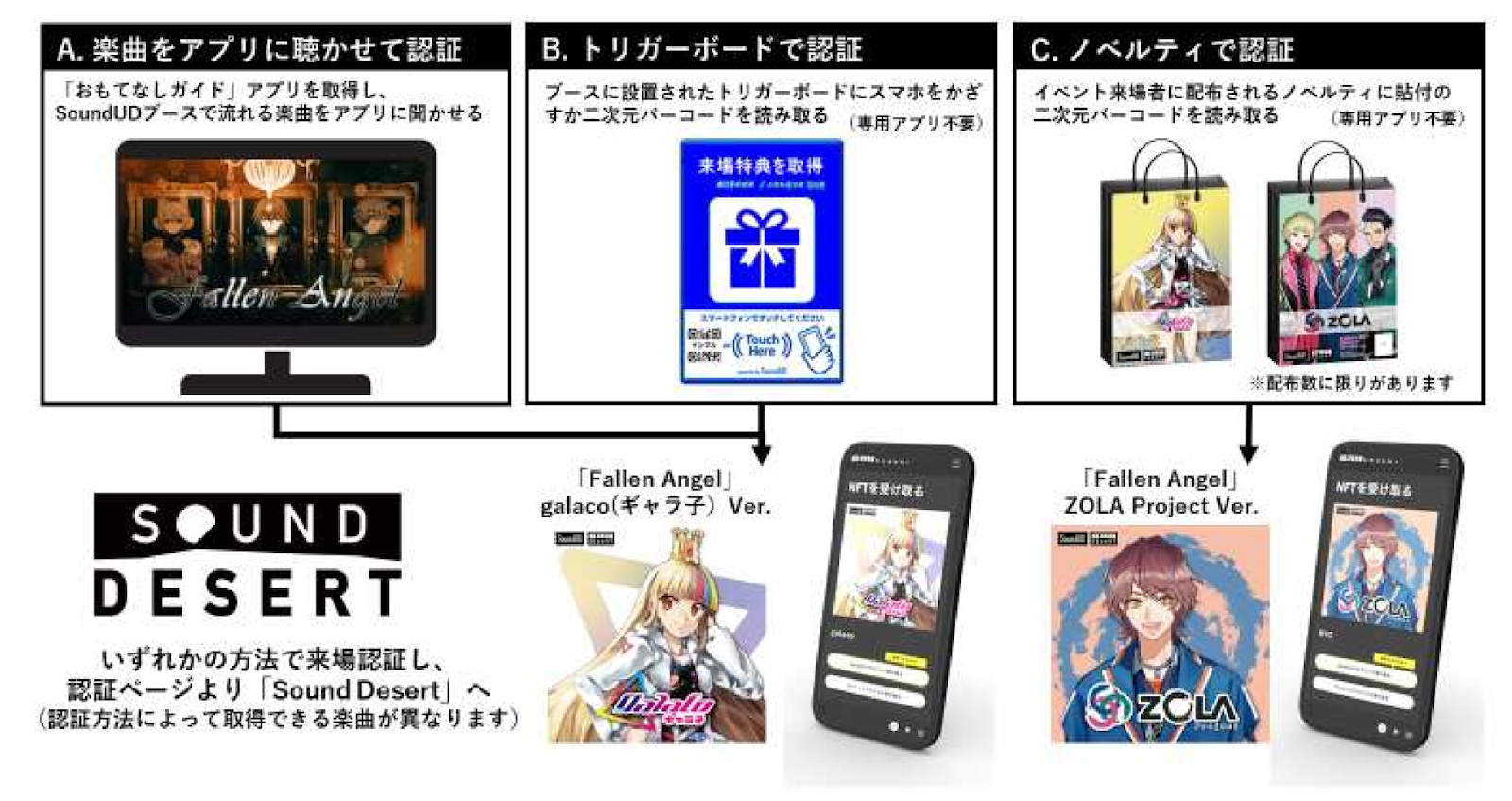 「SoundUD」ブースにおいて、以下 A~C のいずれかの方法で来場認証を行うと、認証後に表示される URLから「Sound Desert」のサイトにアクセスできます。同サイトから音楽 NFT により楽曲を視聴できるほか、参加者自身の来場の証がサイト内に記録されます。