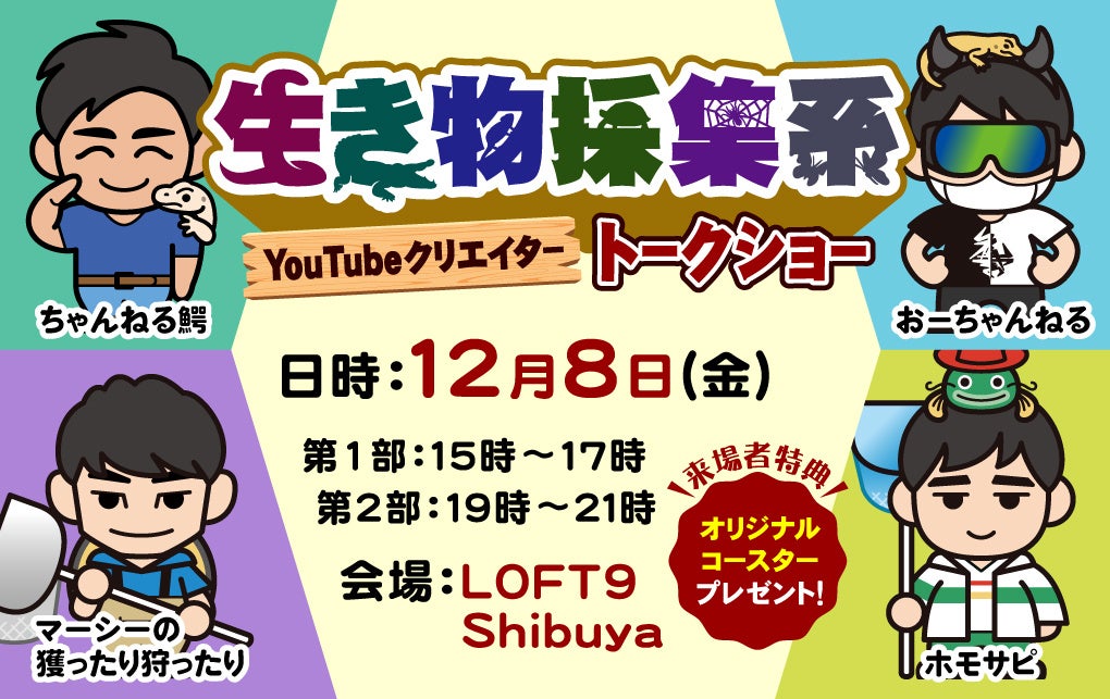YouTubeチャンネル登録者数90万人を超える生き物系YouTuber「ちゃんねる鰐」と親交の深い採集系クリエイターらが一堂に会し、彼らの普段の活動に関連した生き物採集にまつわるトークショーを開催いたします。