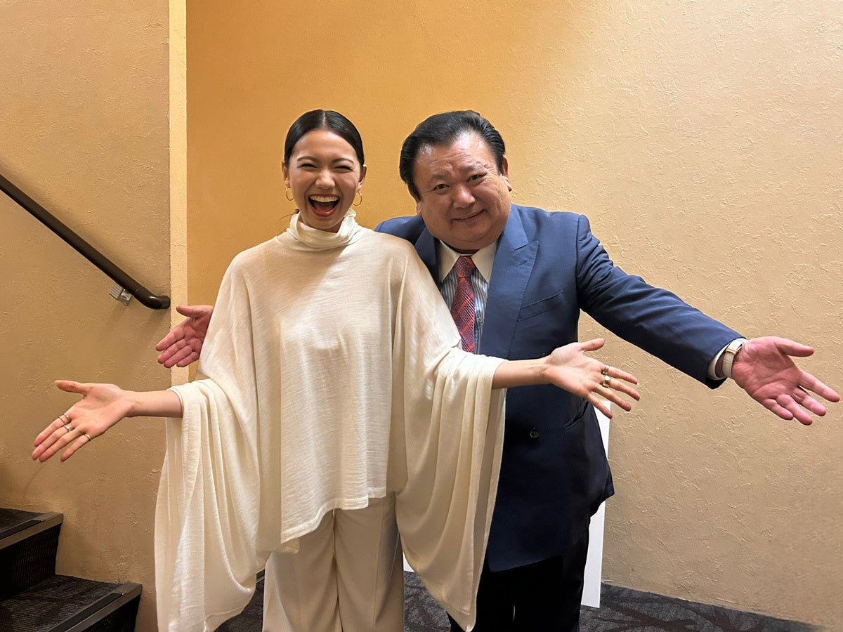 満面の笑顔で〝ざんまいポーズ〟を決める二階堂ふみさん(左)と木村社長