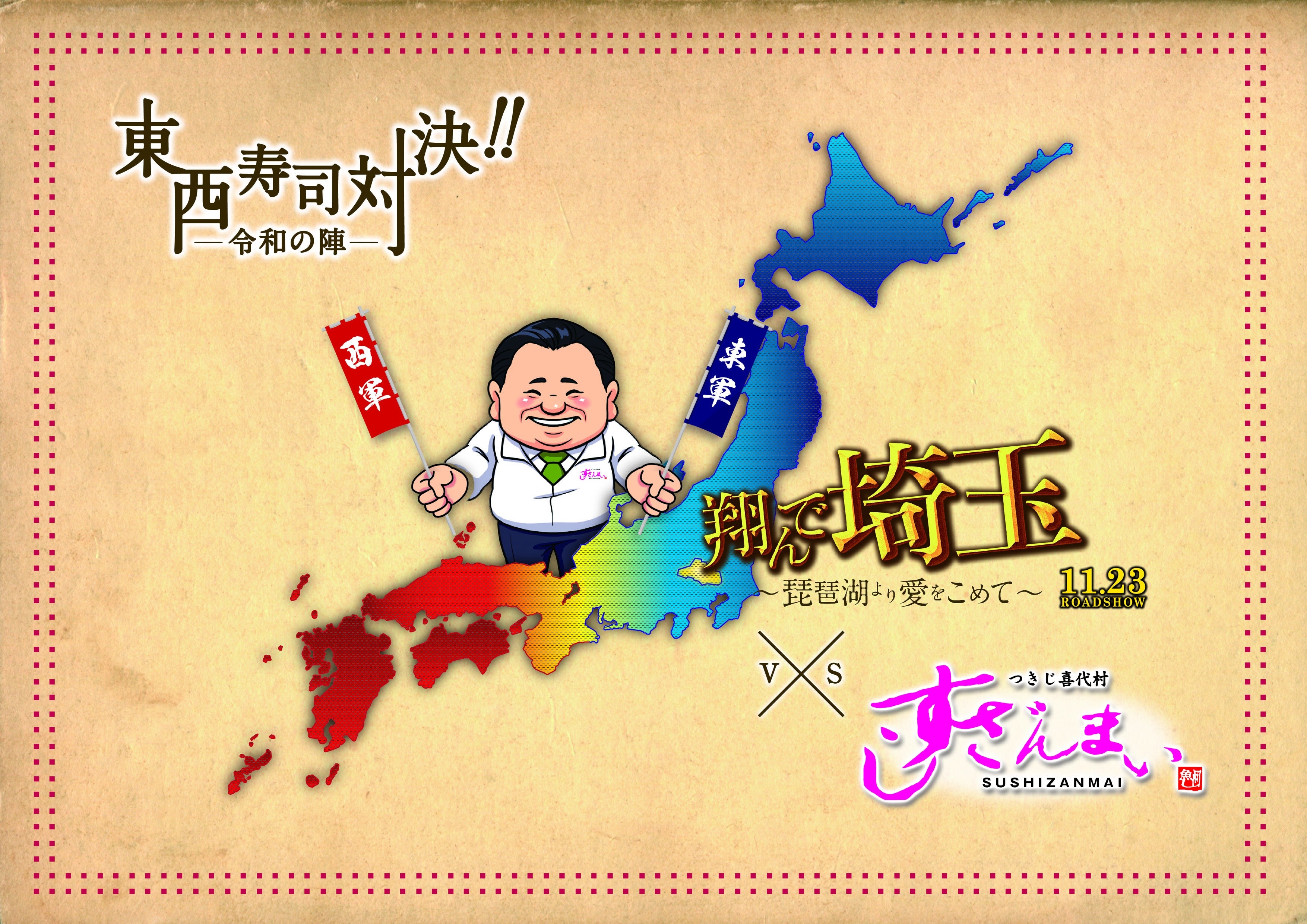 寿司チェーン店「つきじ喜代村すしざんまい」を運営する株式会社喜代村(本社:東京都中央区、以下「喜代村」)は、11月23日(木・祝)から全国公開する映画『翔んで埼玉 ~琵琶湖より愛をこめて~』の公開記念コラボレーションとして、11月13日(月)から12月10日(日)の間、全国の「すしざんまい」39店舗にて期間限定のコラボメニュー『匠のにぎりと本鮪三貫』と『押し寿司と本鮪三貫』(各2,500円・税込2,750円)の2種を販売いたします。