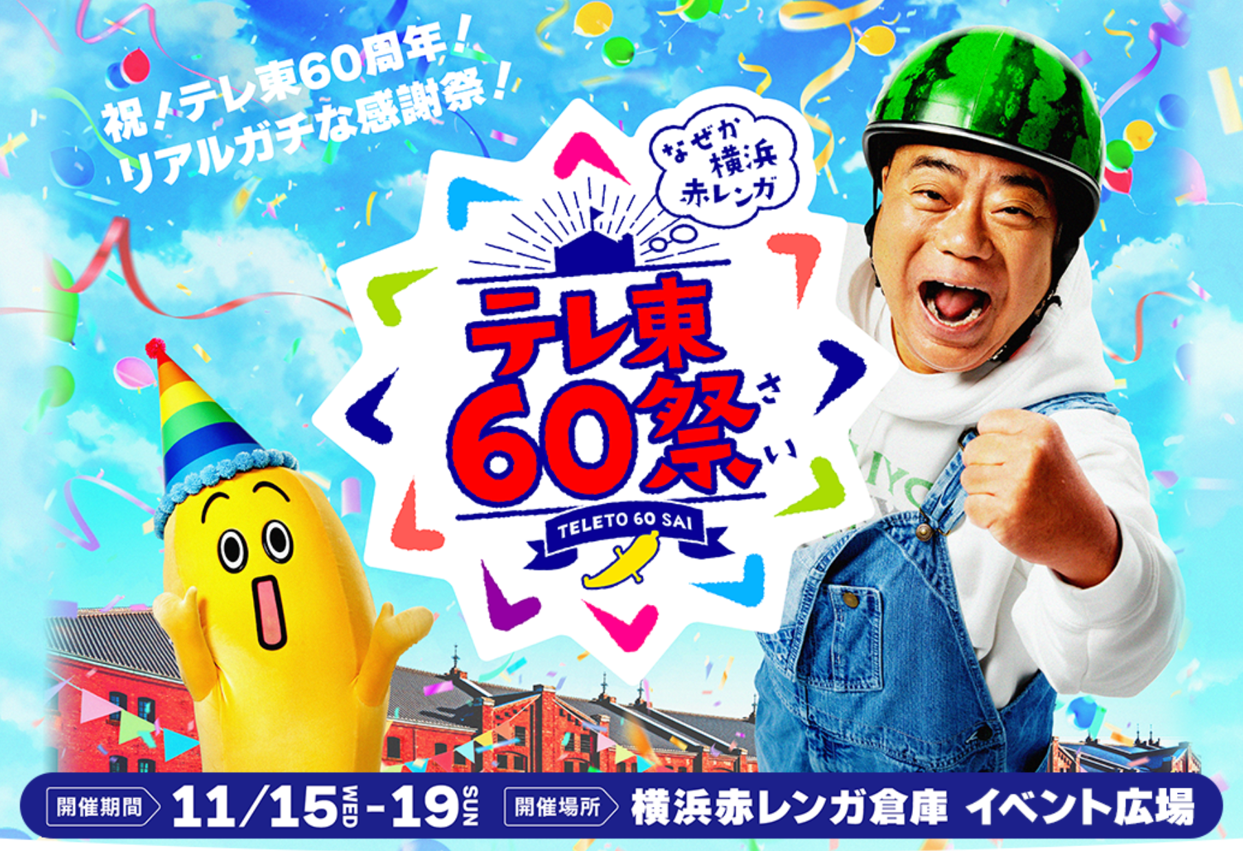 テレビ東京は来年2024年に開局60周年を迎えます。この節目を記念し、日頃テレ東を支えてくださる視聴者の皆様への感謝の気持ちを込めて11月15日(水)~19日(日) の期間、横浜赤レンガ倉庫イベント広場にて60周年記念イベント「テレ東60祭@なぜか横浜赤レンガ」を開催いたします。