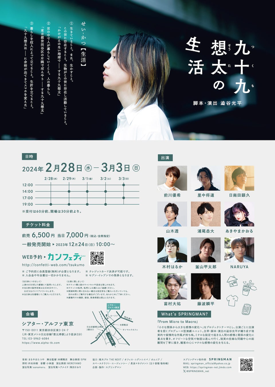 澁谷光平が主宰するプロデュース型ユニット、スプリングマンの新作舞台「九十九想太の生活」が 2024年2月28日(水)~3月3日(日)、シアター・アルファ東京にて上演される。